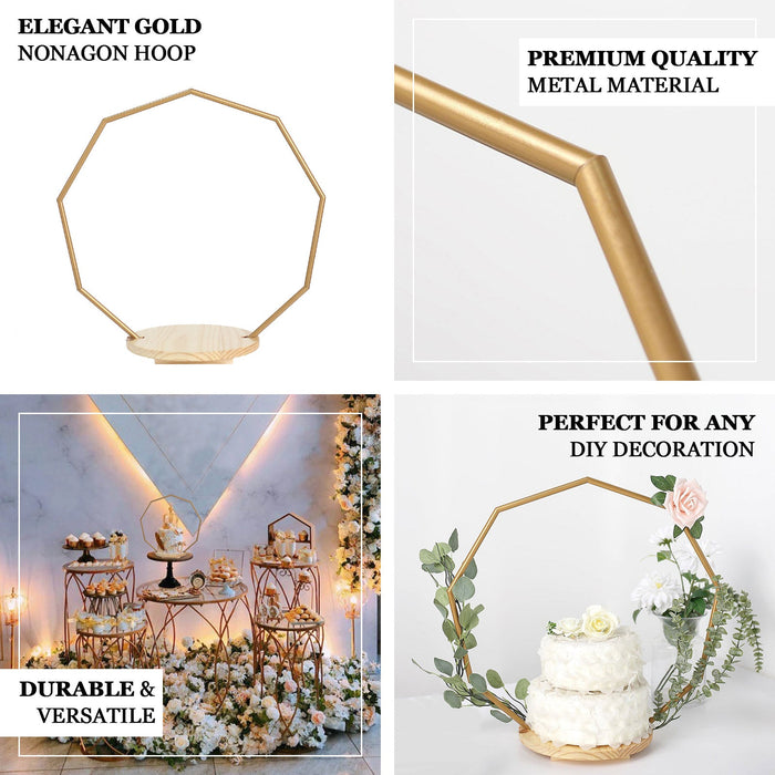 27" Gold Nonagon Metal Floral Hoop Cake Stand, Dessert Display Centerpiece Stand With Wooden Base