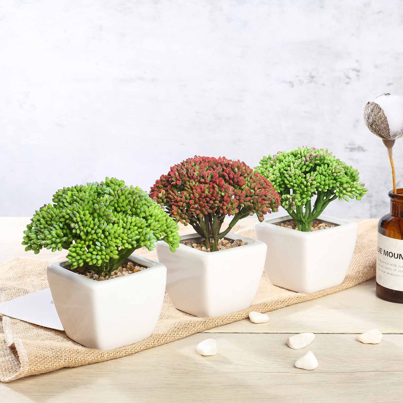 3 Pack | 6" Ceramic Planter Pot and Artificial Joy Sedum Succulent Plant