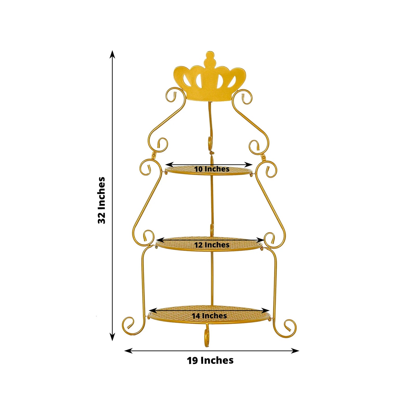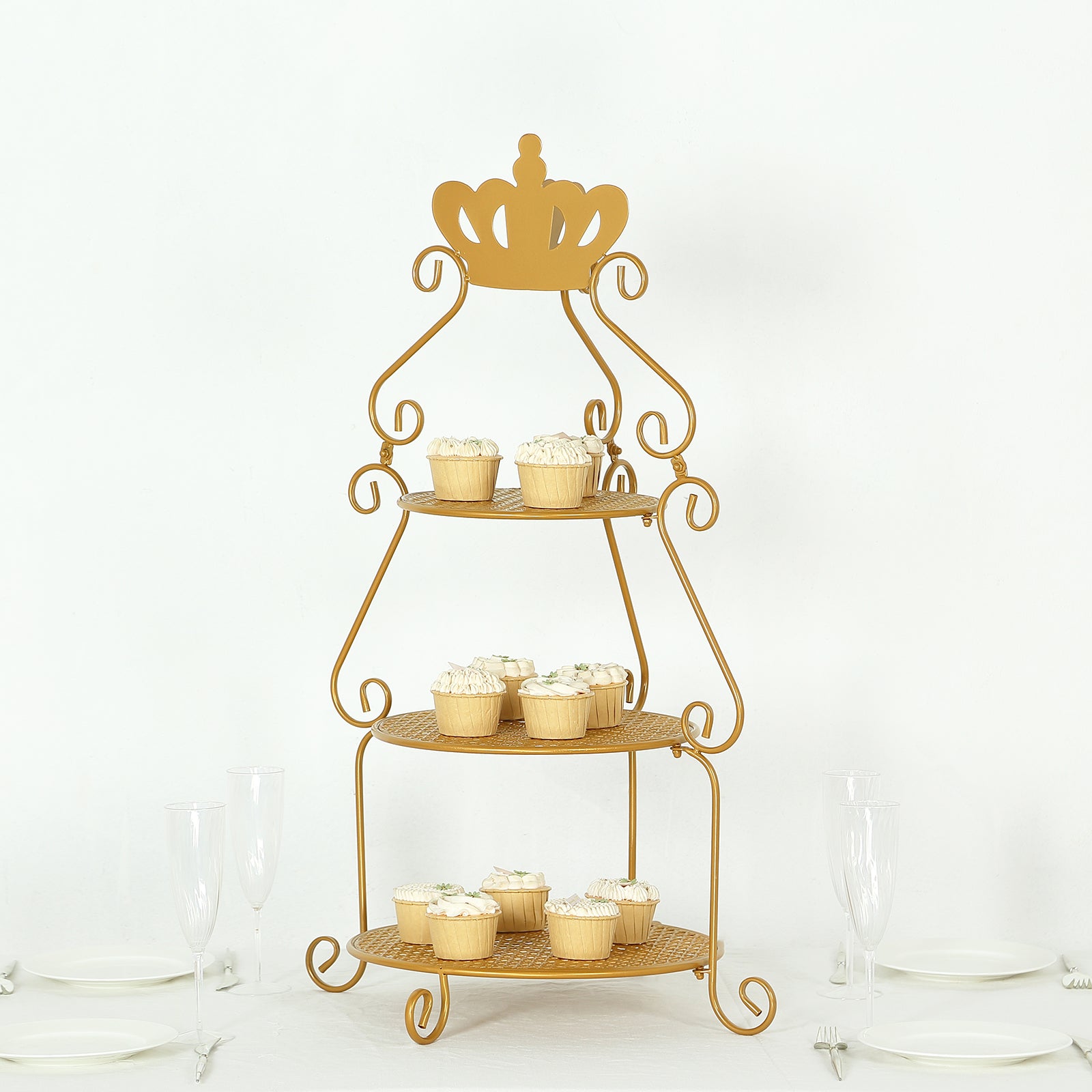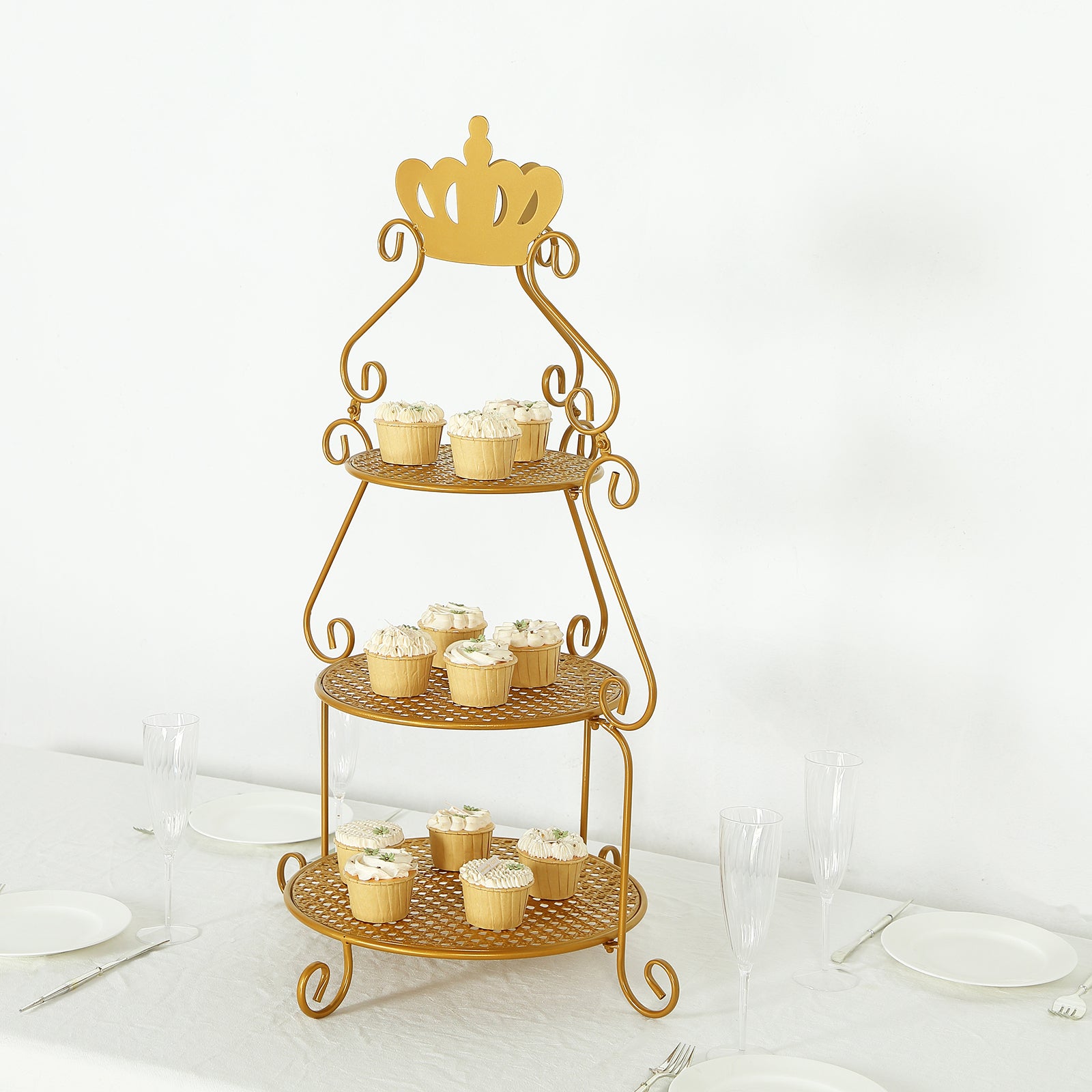 The 3-Tier Round Gold Cupcake Stand is a stunning centerpiece. Its crown top adds elegance. This stand is perfect for weddings and special events.