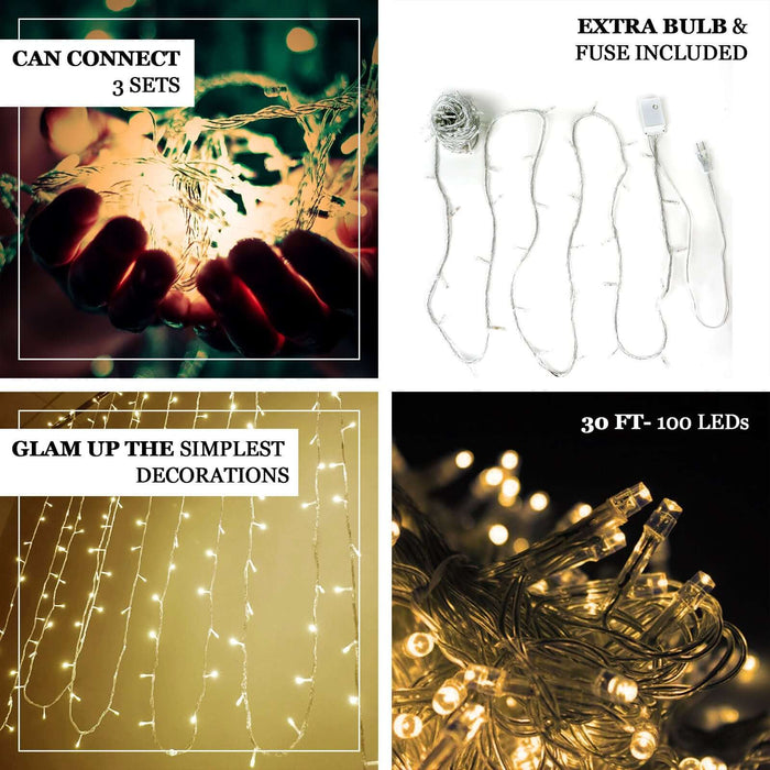 With 100 LED bulbs spread across 30 feet, these lights offer ample coverage for larger spaces. Whether you decide to drape them over tables, hang them from trees, or create a dazzling backdrop, the versatility of these string lights allows for endless creative possibilities. Make your event unforgettable with the perfect lighting solution.
