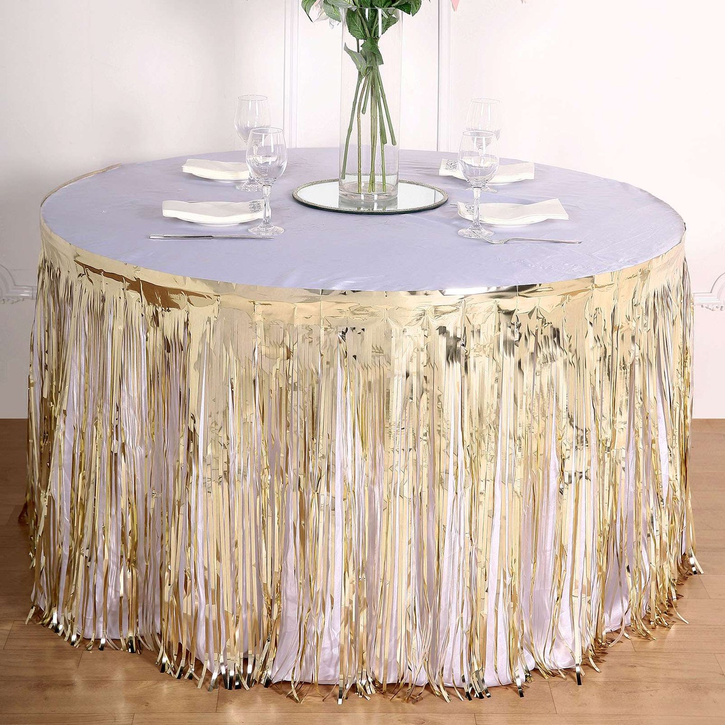 | Style: Metallic Foil Fringe Table Skirt |