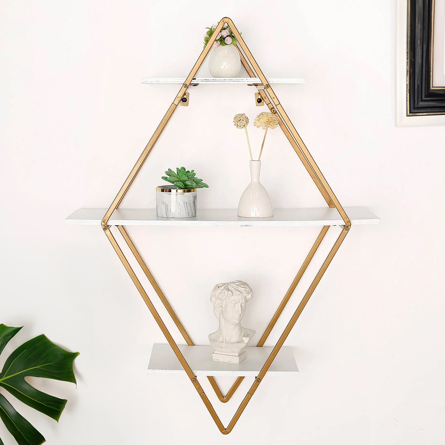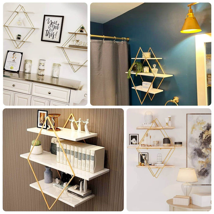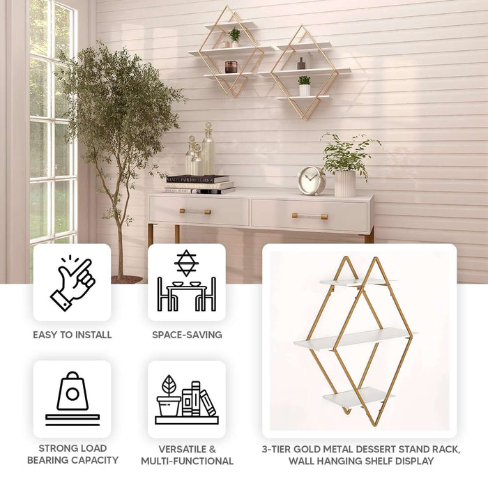 31" Geometric Diamond Shaped 3-Tier Gold Metal Dessert Cupcake Stand Rack, Wall Hanging Display Shelf Display, Book Shelf With White Wood Panels