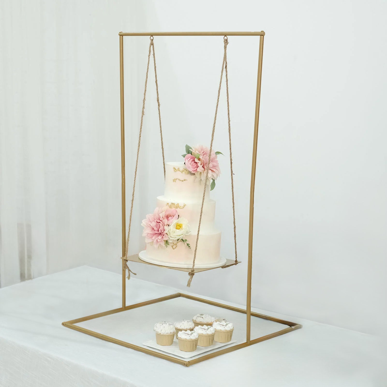 The combination of metal and natural jute rope provides a unique aesthetic. This cake stand swing is versatile and complements various décor styles. It enhances the overall look of your dessert table.