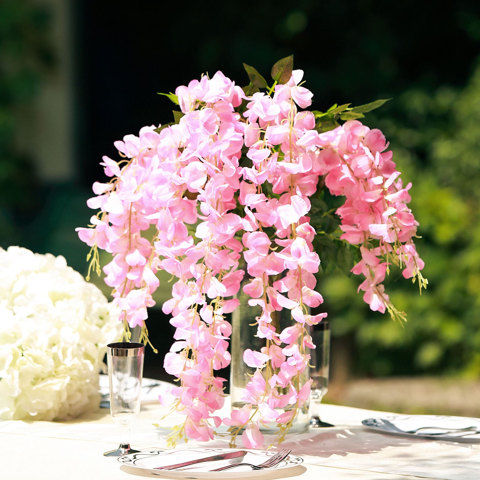 Combine these vines with other décor items, like table runners or centerpieces, to create a cohesive look. Use them alongside our satin and rosette tablecloths for a stunning contrast. The soft pink of the wisteria pairs beautifully with various table linens, enhancing the overall aesthetic.
