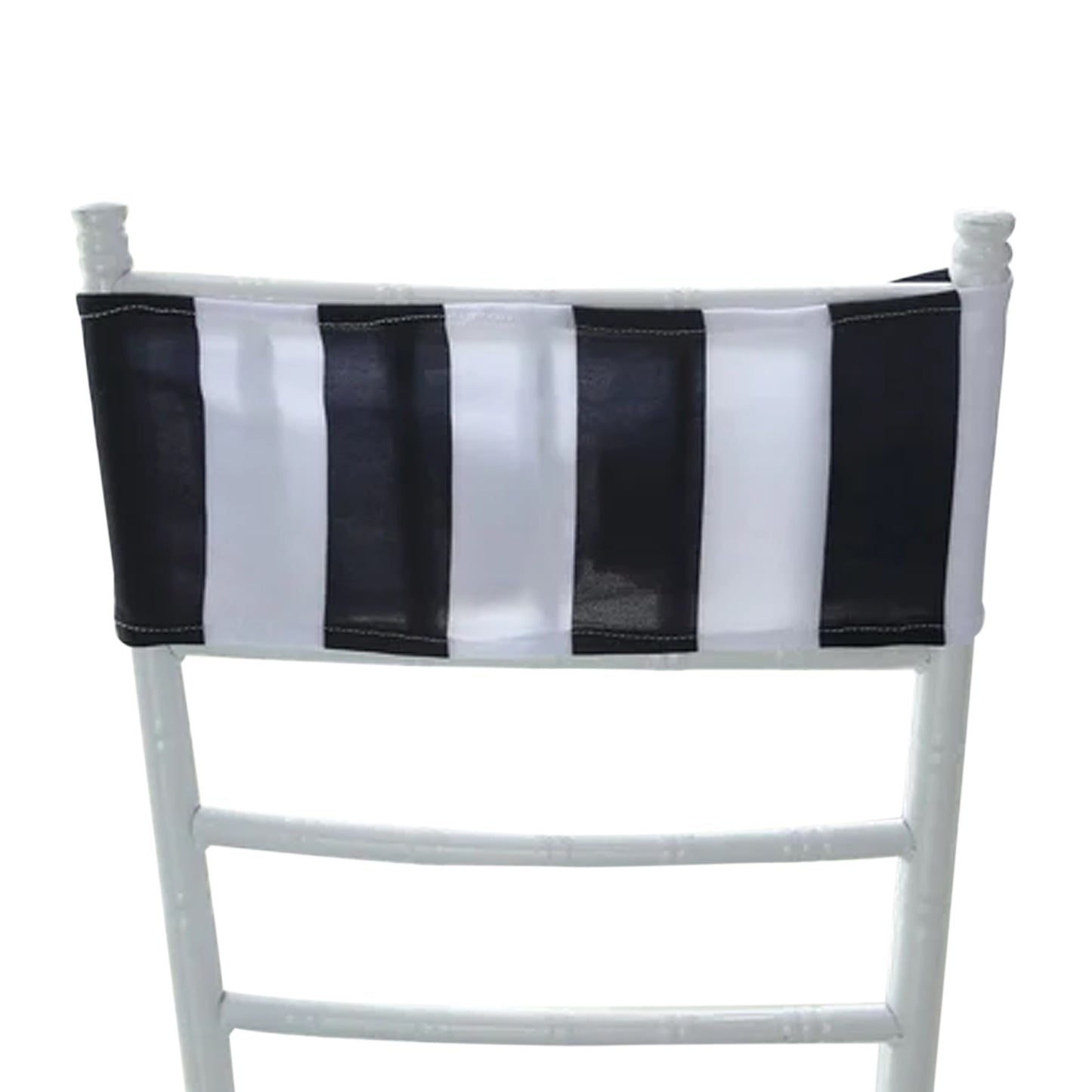 Our Black/White Stripe Spandex Chair Sashes are crafted from premium quality spandex. This four-way stretch material ensures a snug fit on various chair styles. The durability of spandex means these sashes can withstand multiple uses while maintaining their elegant appearance.