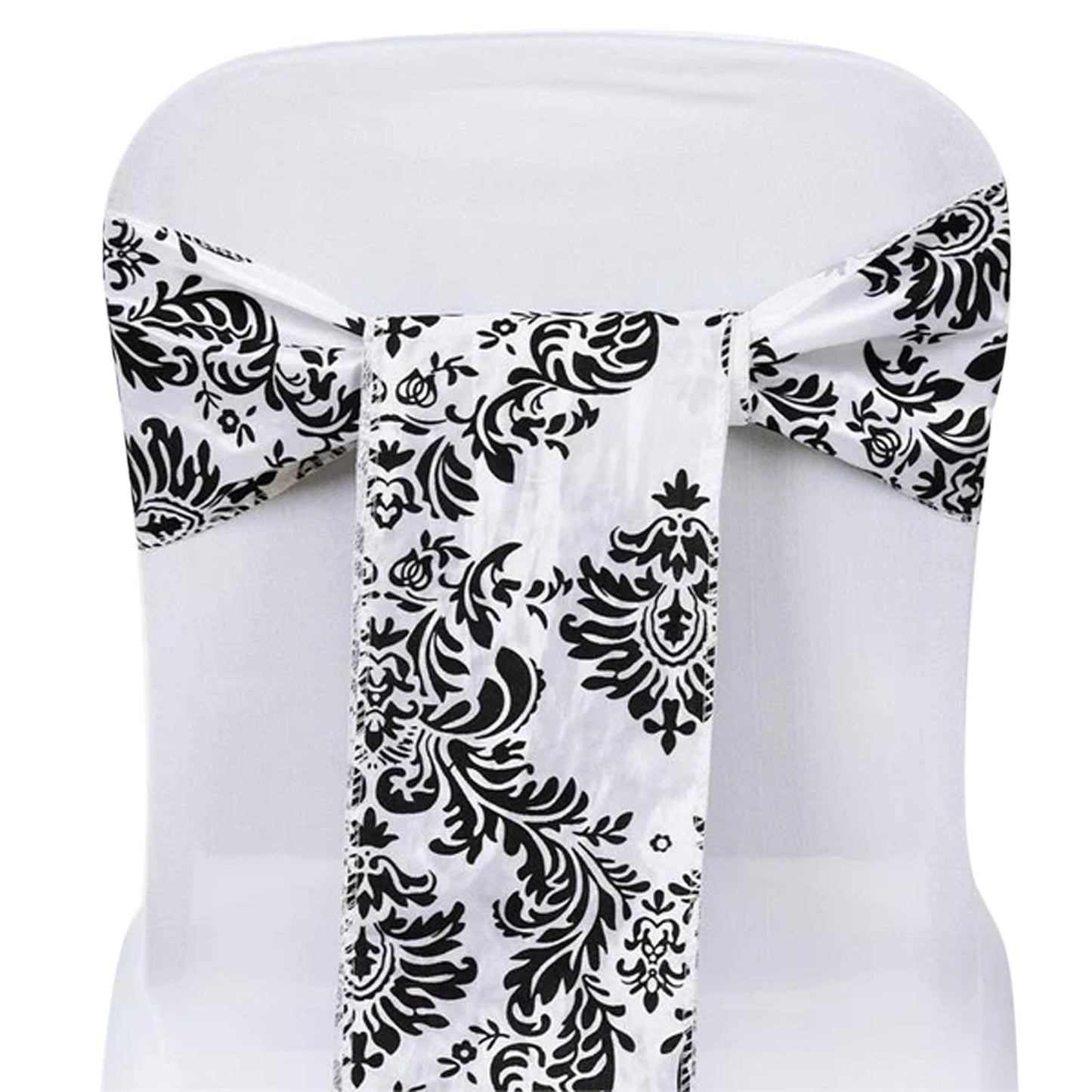 Our Black and White Taffeta Damask Flocking Chair Sashes are incredibly versatile. They can be styled in multiple ways to suit your event's theme. Use them as elegant chair ties or create stunning bows for a decorative flair.