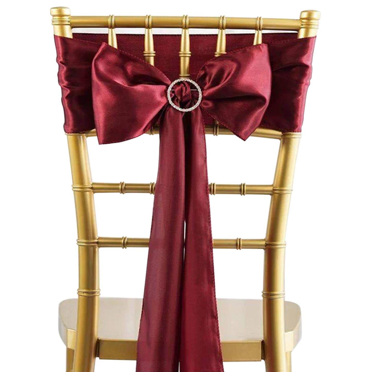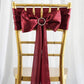 Burgundy satin chair sashes are a versatile decor element that can enhance any event. For a classic look, tie the sashes into simple bows and pair them with white table linens. The contrast between the burgundy and white creates a clean and elegant aesthetic.