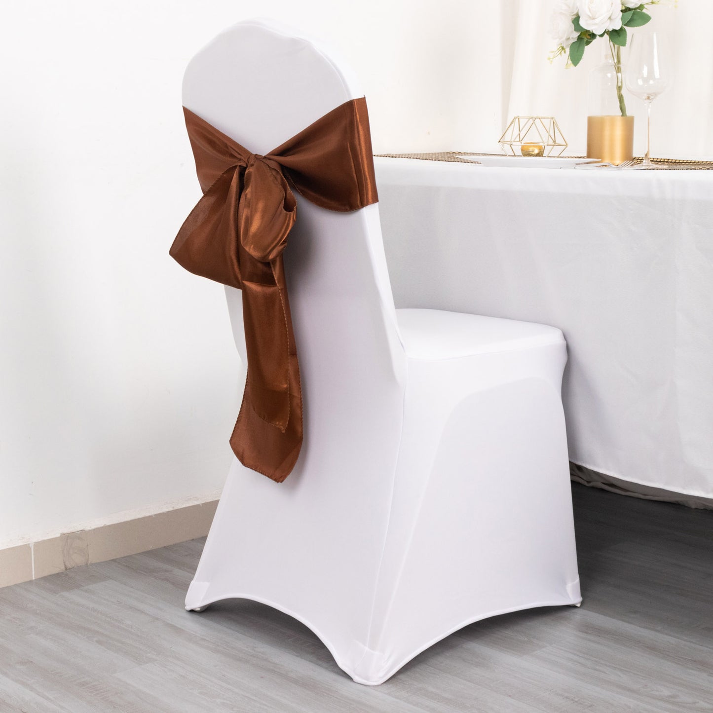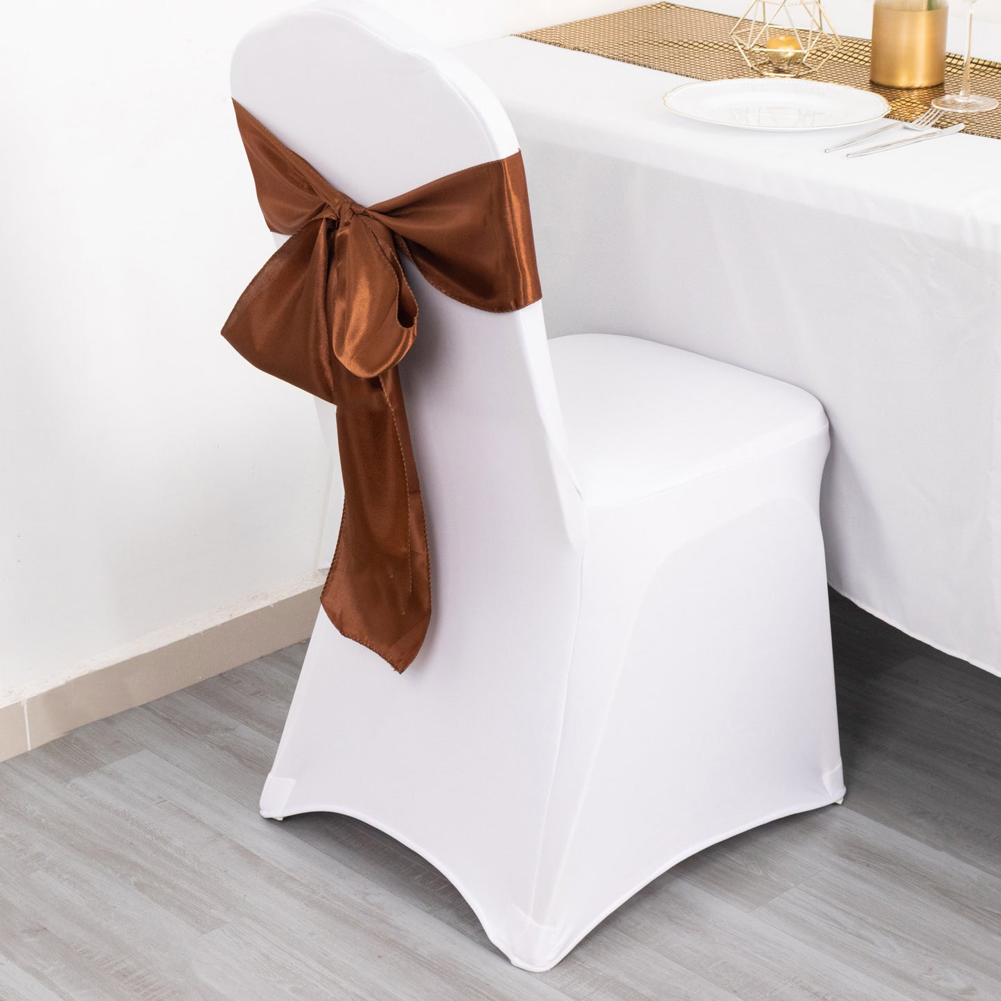 Our Cinnamon Brown Satin Chair Sashes are versatile. They can be used on banquet chairs, folding chairs, and more. This makes them ideal for any occasion, from formal to casual.