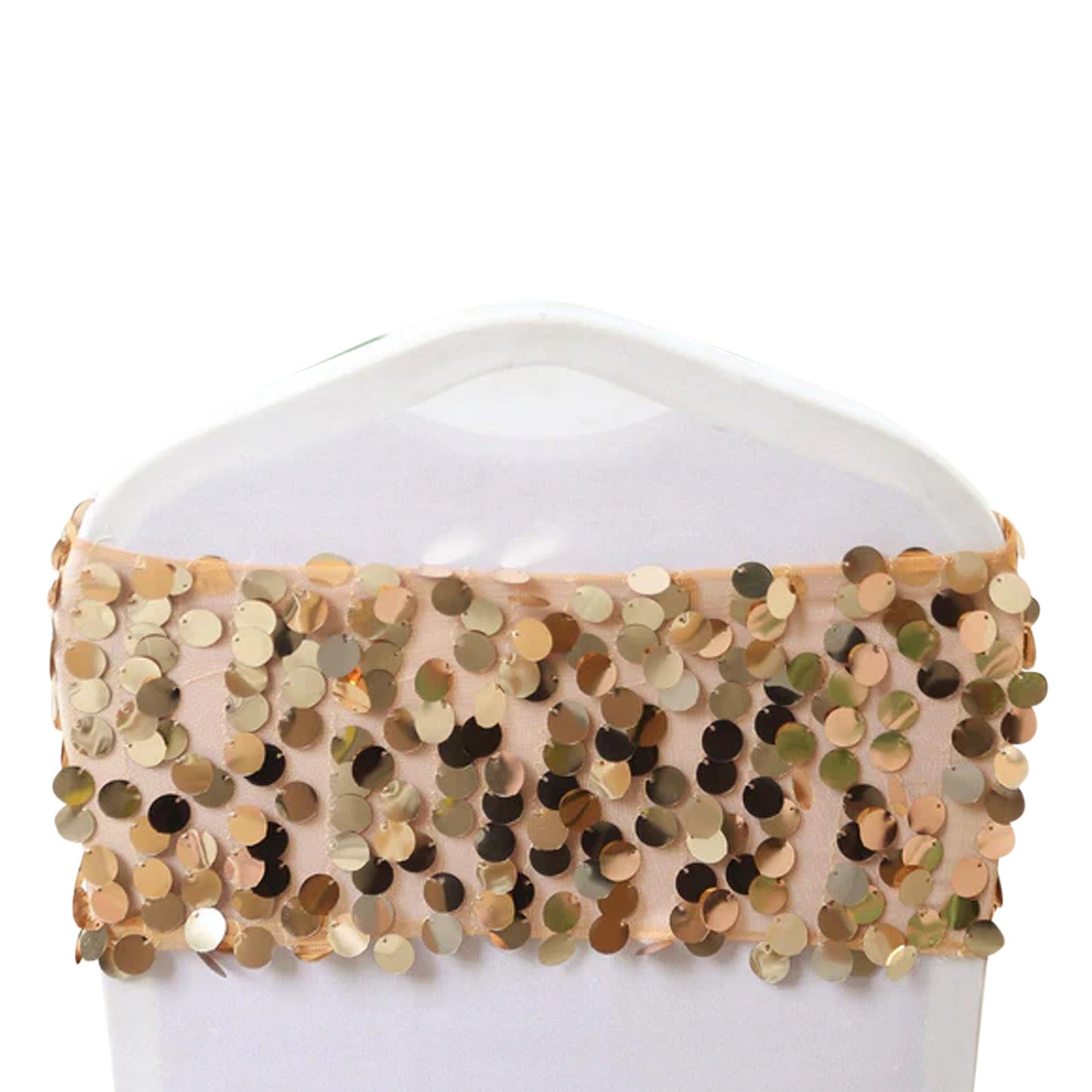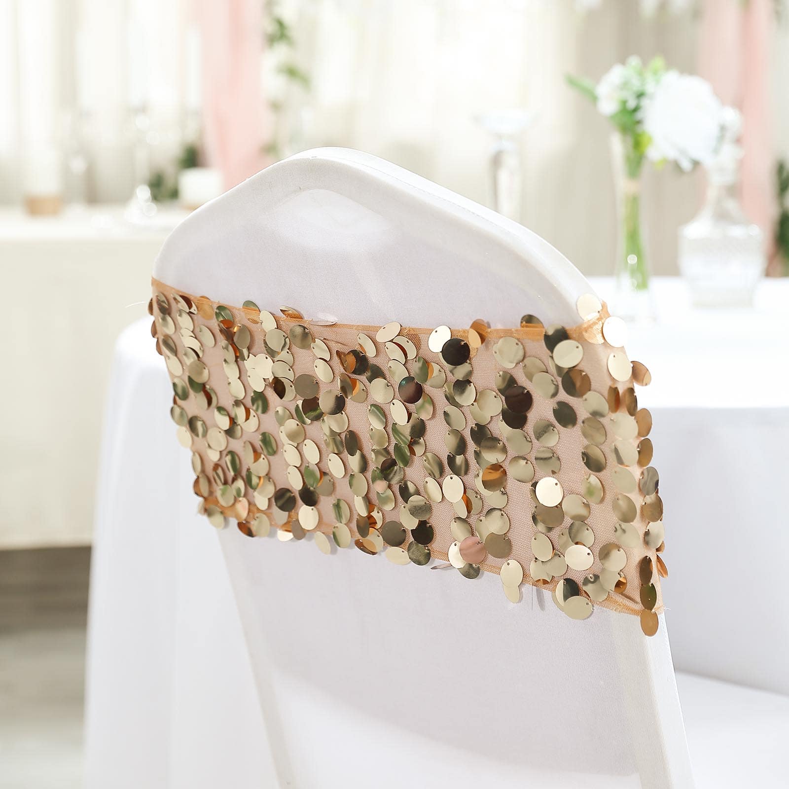 Sequin chair sashes, like our Gold Big Payette Sequin Bands, offer numerous advantages. They instantly elevate the visual appeal of your event. The shimmering sequins add a luxurious touch that enhances any décor style.