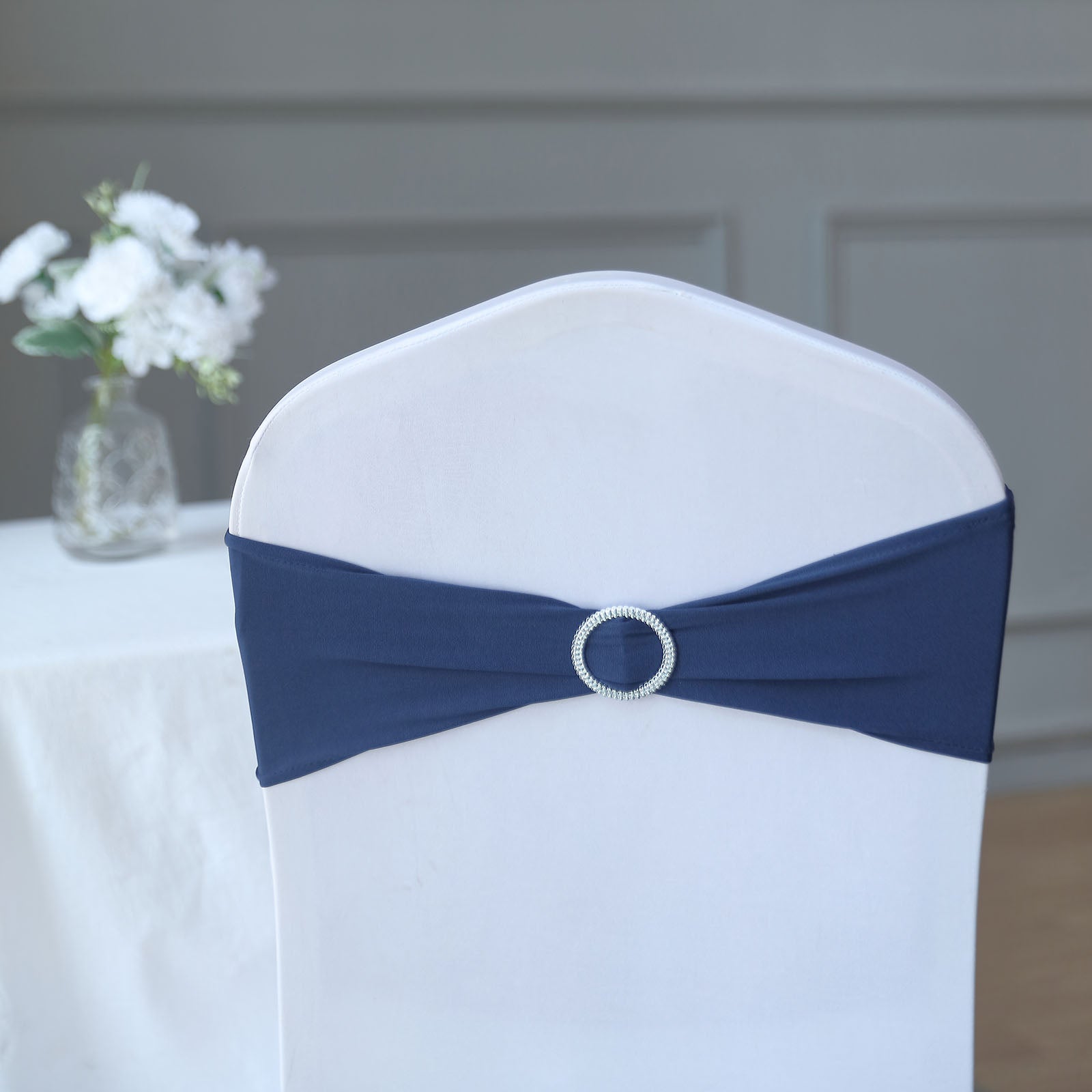 Our Navy Blue Spandex Stretch Chair Sashes are designed for convenience. They are easy to put on and take off, saving you time during event setup. Simply slip them over the chair and secure with the buckle for a flawless finish.