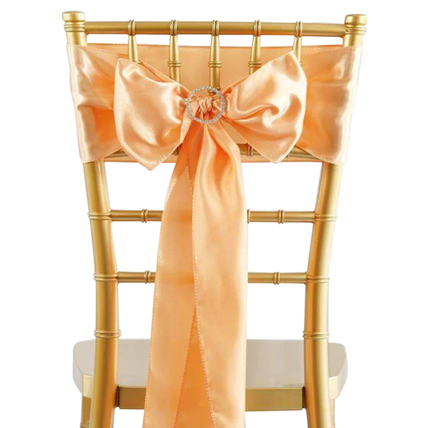 Peach Satin Chair Sashes are an excellent choice for adding elegance to your event. The peach color is versatile and complements various color schemes, making it suitable for weddings, receptions, and other special occasions. The satin material adds a luxurious touch to any decor.
