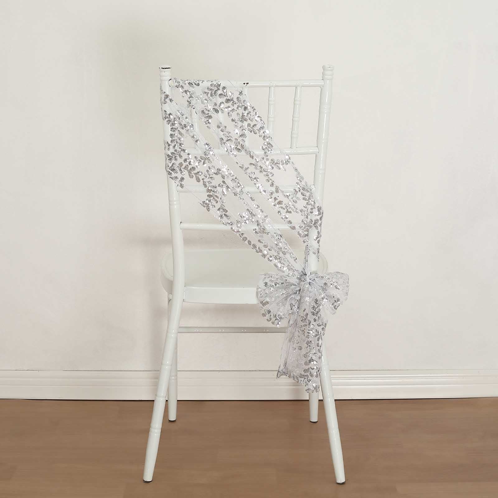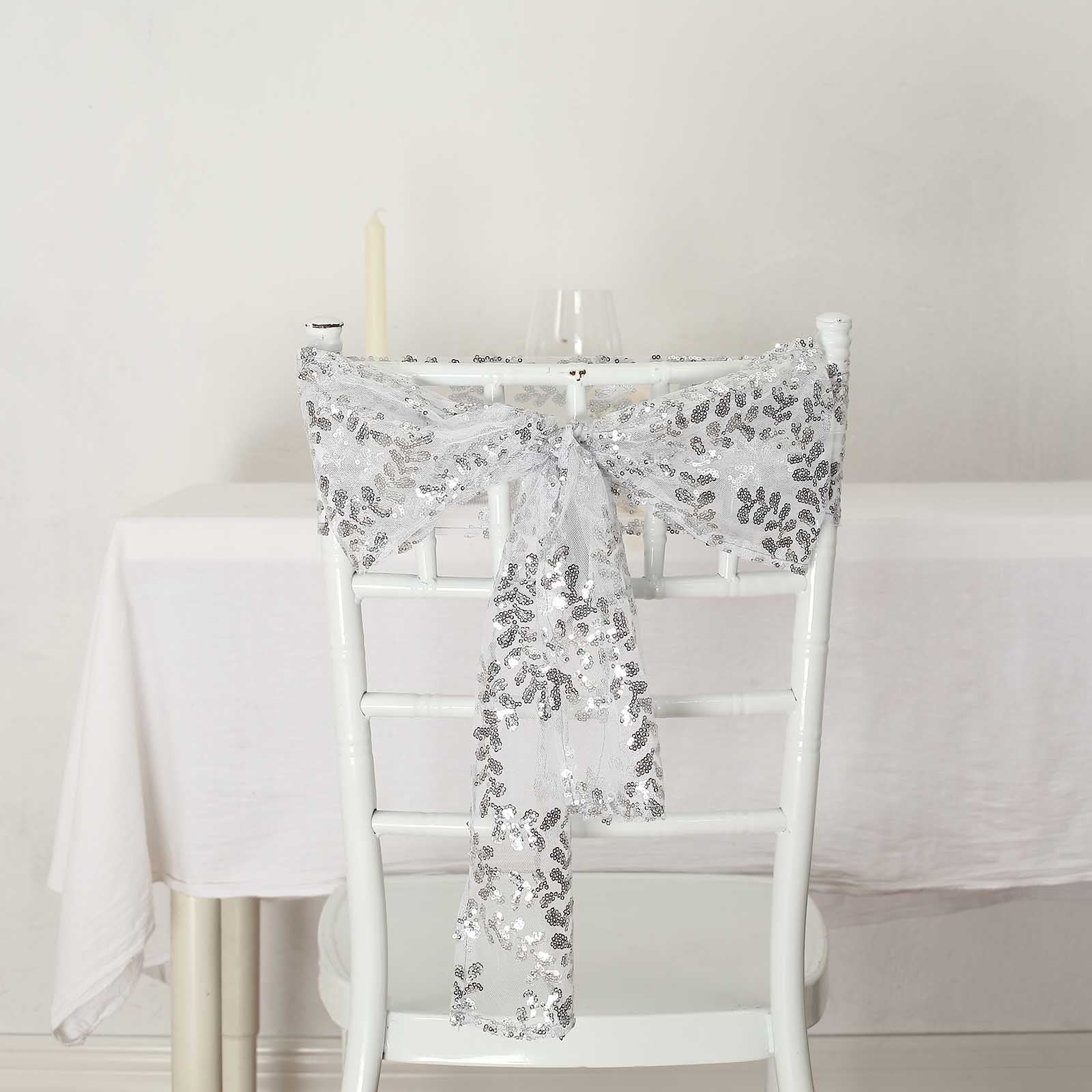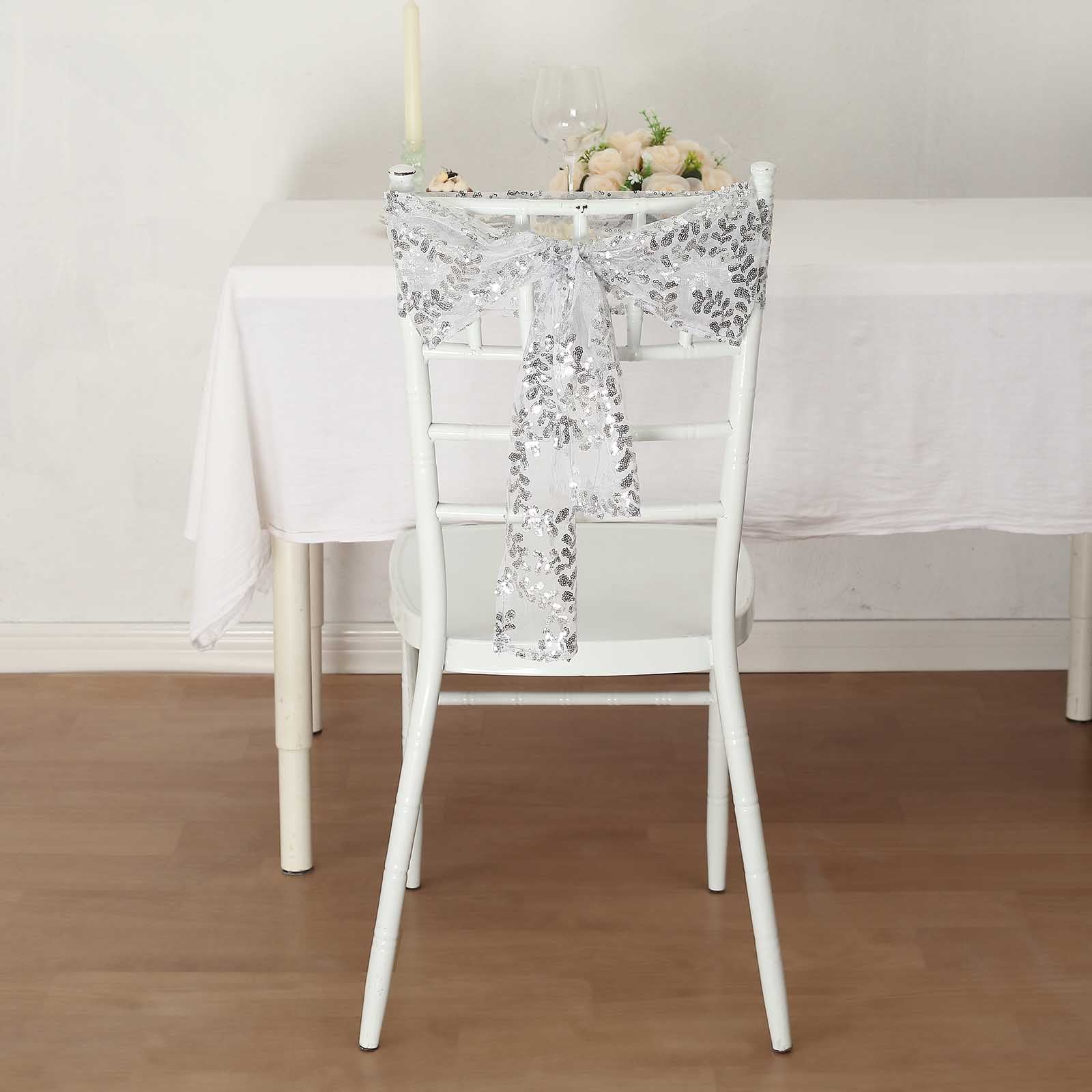 5 Pack Silver Tulle Wedding Chair Sashes with Leaf Vine Embroidered Sequins - 6"x88"