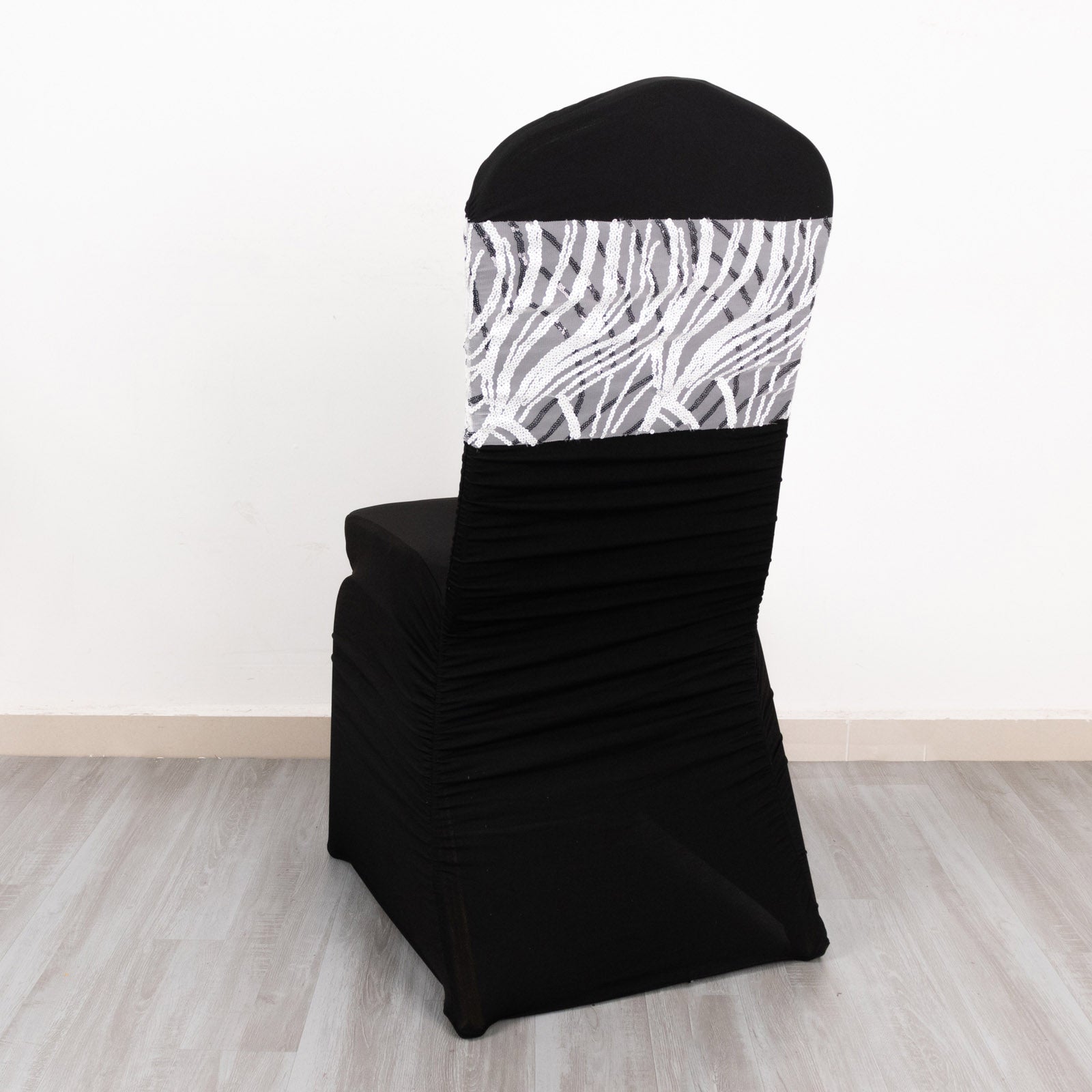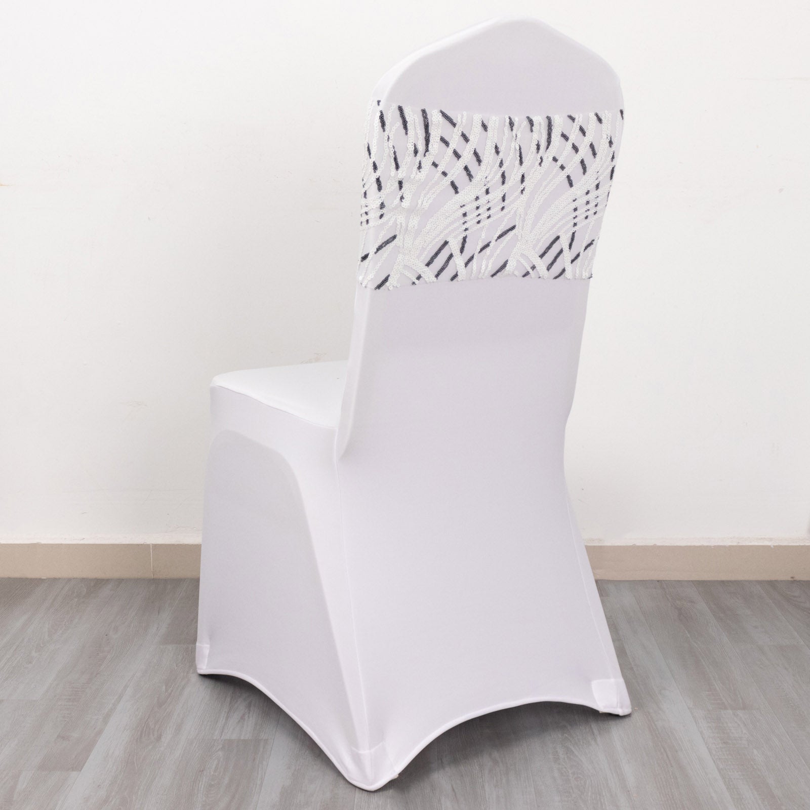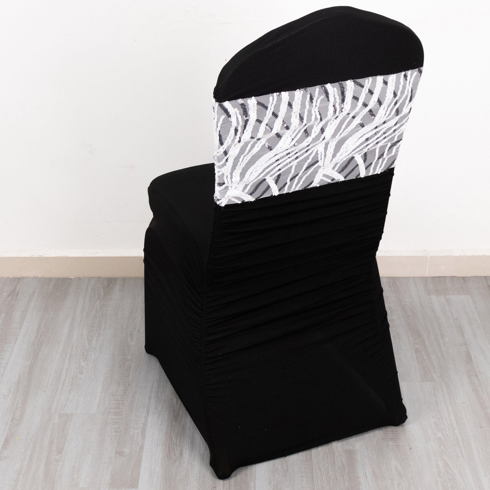 The White Black Wave Chair Sash Bands can be paired with various table linens for a cohesive look. Consider using matching table runners or sequin tablecloths to create a stunning visual effect. This coordination enhances the elegance of your event.