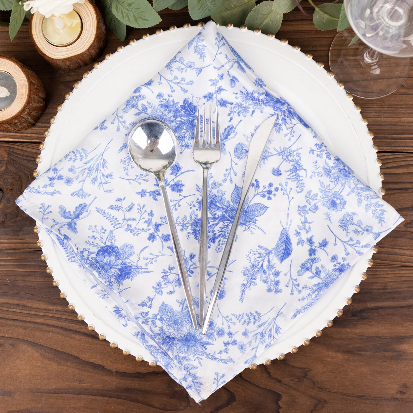 5 Pack White Blue Satin Cloth Dinner Napkins in French Toile Floral Pattern, Wrinkle Resistant Table Napkins - 20"x20"