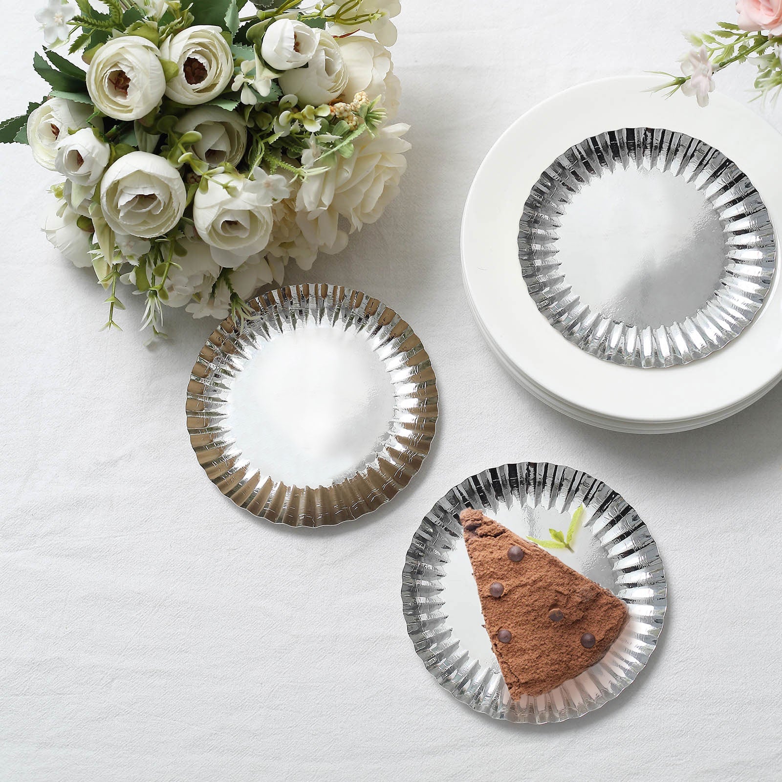 Our 5" Metallic Silver Scalloped Rim Dessert Paper Plates are versatile for different dishes. They are perfect for serving mini desserts, salads, or appetizers. Their size makes them ideal for finger foods and smaller bites.