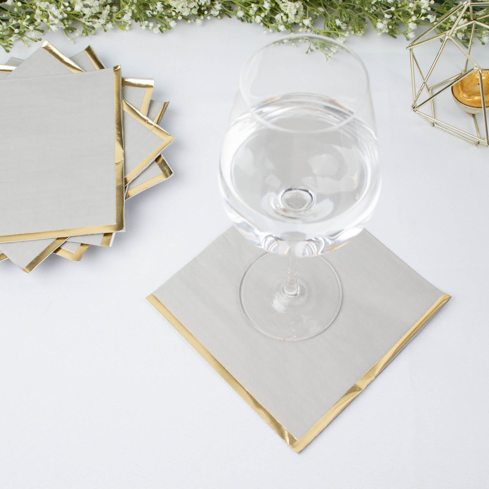 Add a touch of sophistication to your event with the stunning gold foil edge of our cocktail napkins. This eye-catching detail enhances the overall aesthetic of your table setting. The shimmering edge contrasts beautifully with the soft gray, creating a chic and elegant look.