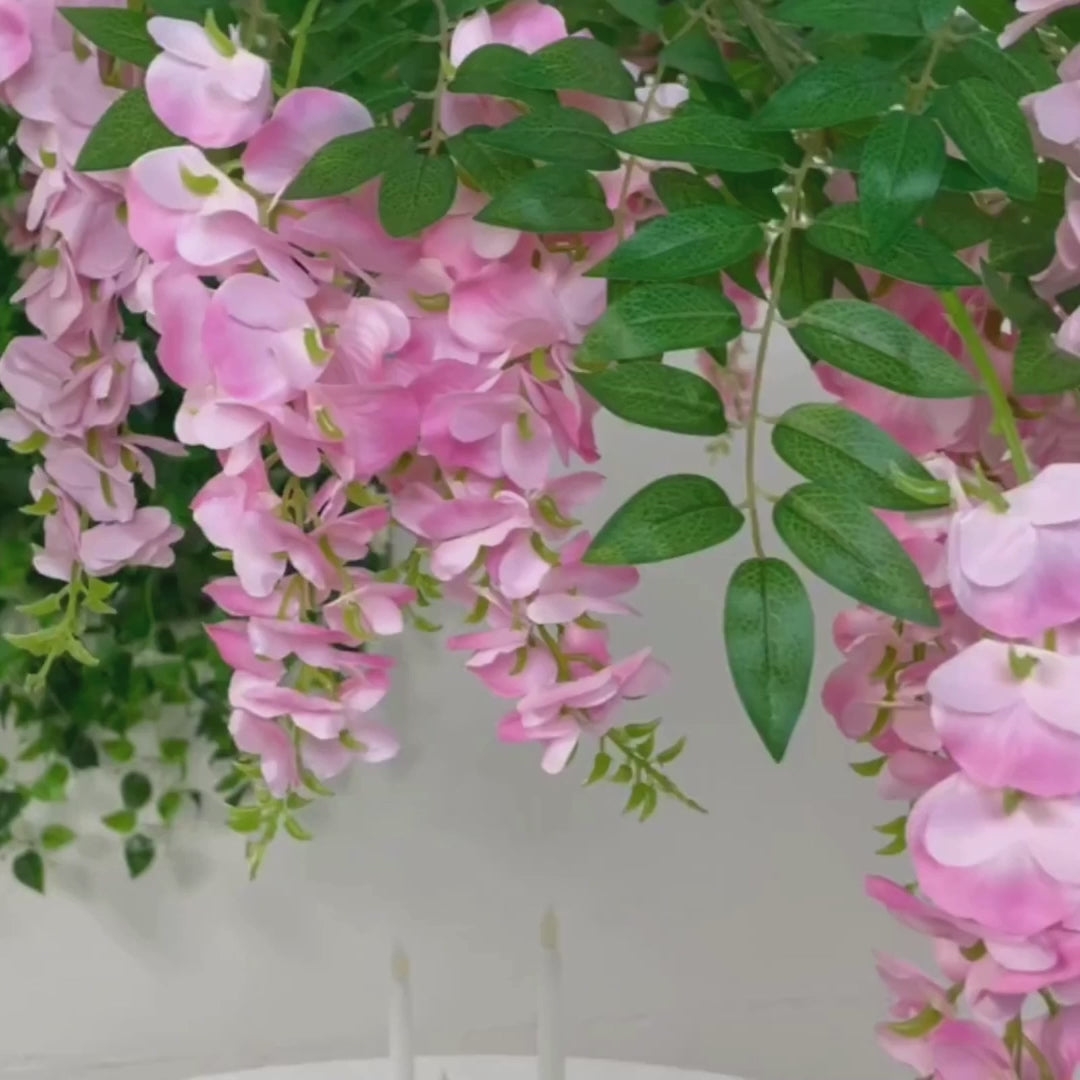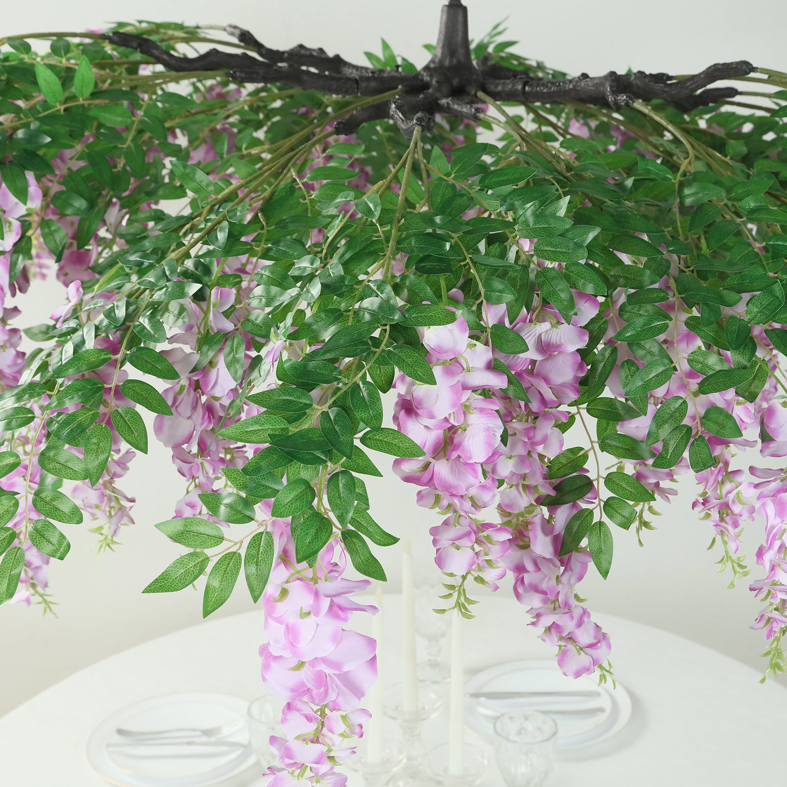 Whether used as a centerpiece, a ceiling installation, or a backdrop accent, this wisteria vine canopy elevates your décor with effortless sophistication. Its interchangeable branches allow for customizable arrangements, making it an ideal choice for weddings, receptions, and special celebrations.