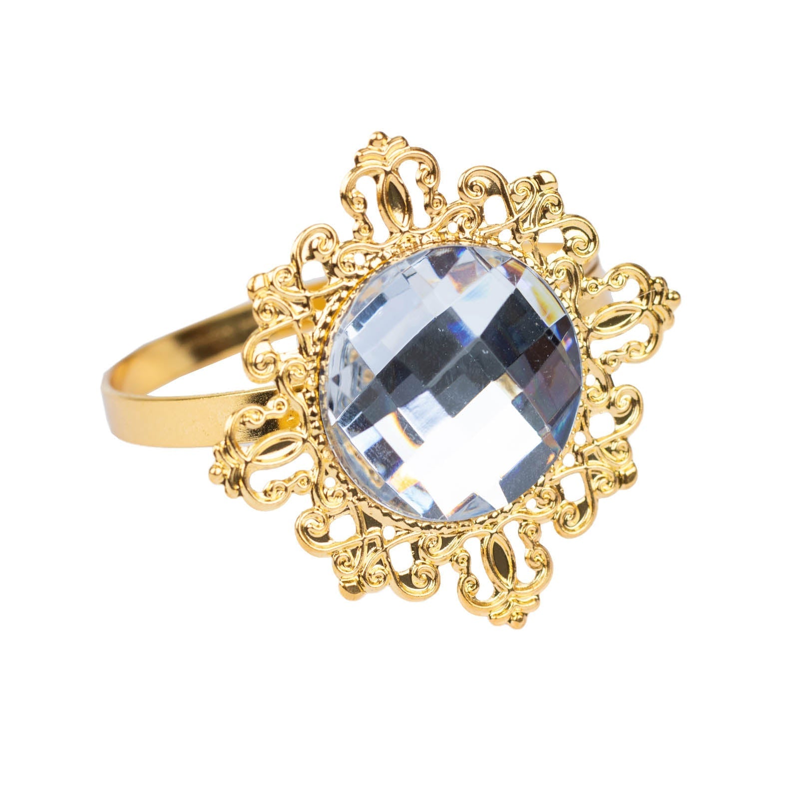 Napkin rings are decorative accessories used to hold napkins in place. They enhance table settings and add a touch of elegance. Our Gold Metal Clear Crystal Rhinestone Napkin Rings are not only stylish but also functional. They keep napkins neatly organized, making your dining experience more enjoyable.
