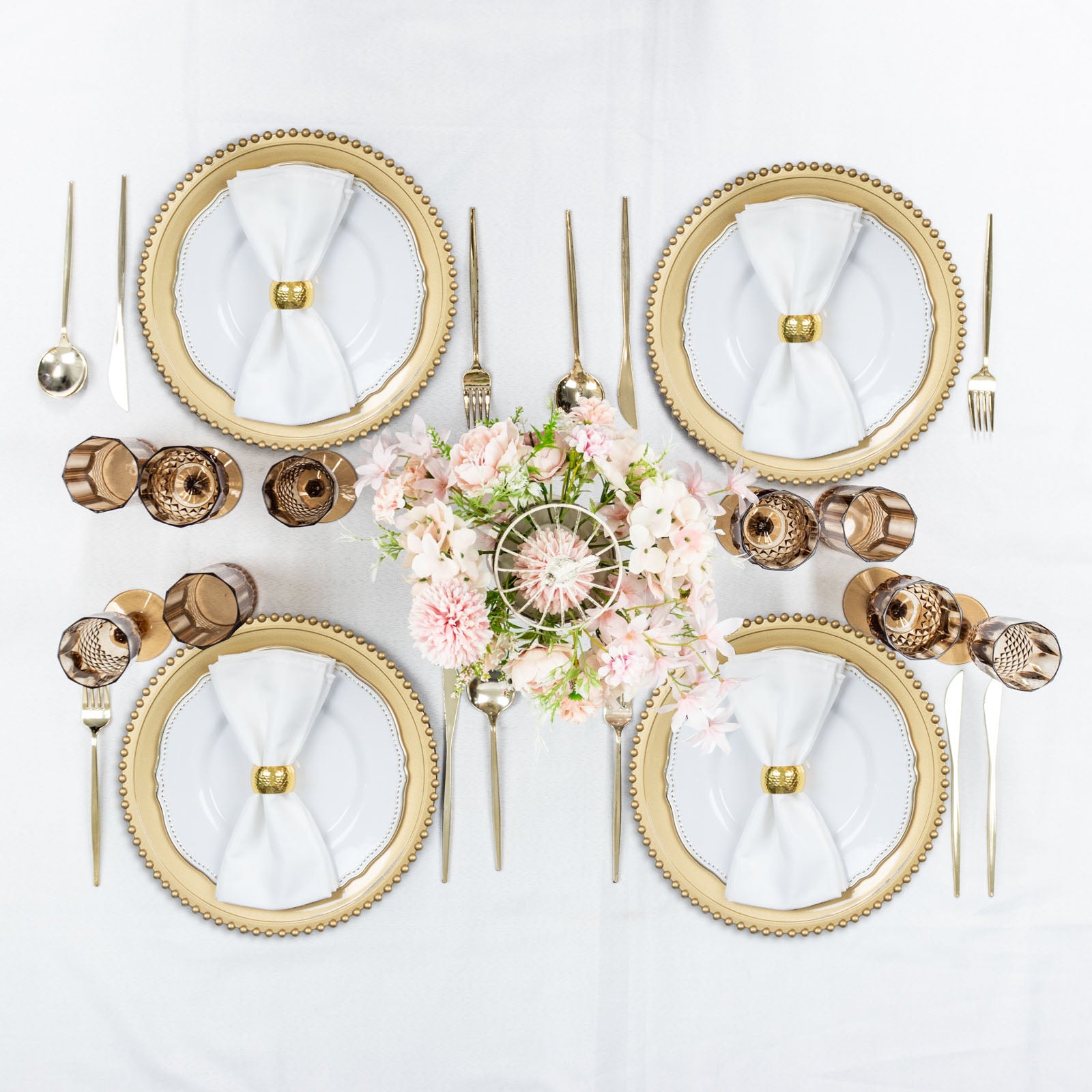 Amber Gold Crystal Cut Reusable Plastic Wedding Flute Glasses can enhance your event décor in many ways. Pair them with matching table linens, such as polyester tablecloths or satin & taffeta table runners, to create a cohesive look. The elegant design of the glasses will complement your overall theme beautifully.