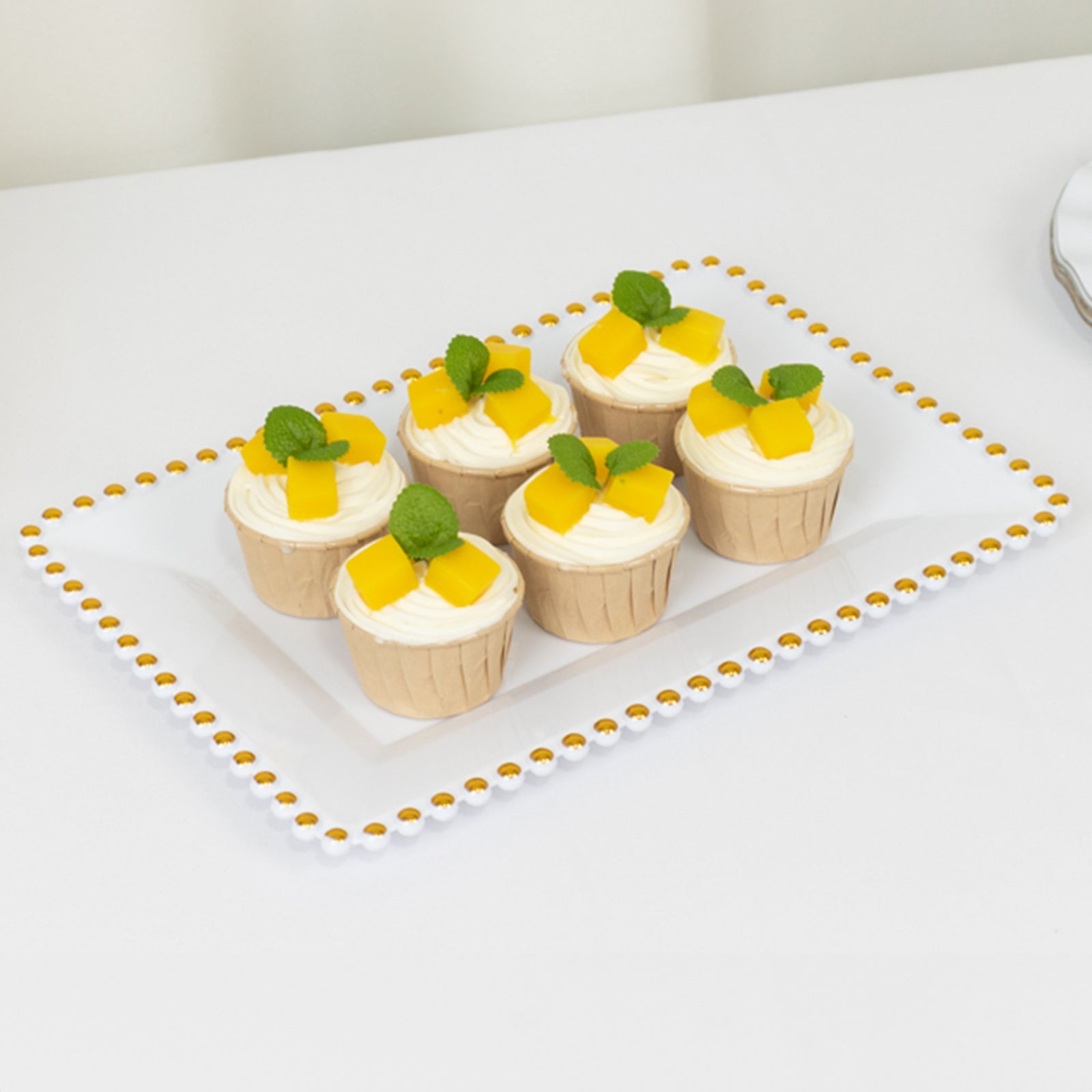 Elevate your party setup with our elegant White Acrylic Rectangular Serving Trays. Featuring a sleek, transparent design adorned with a beaded gold rim, these 13-inch decorative platters combine style and practicality, making them a must-have for any celebration.