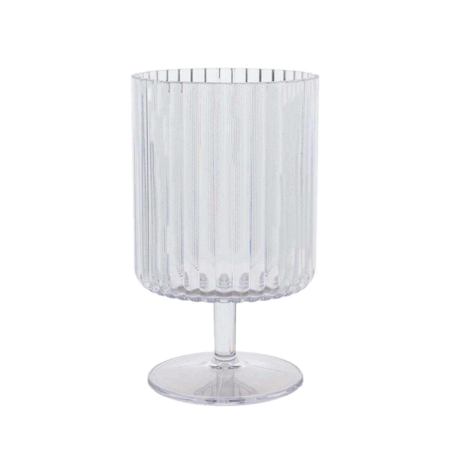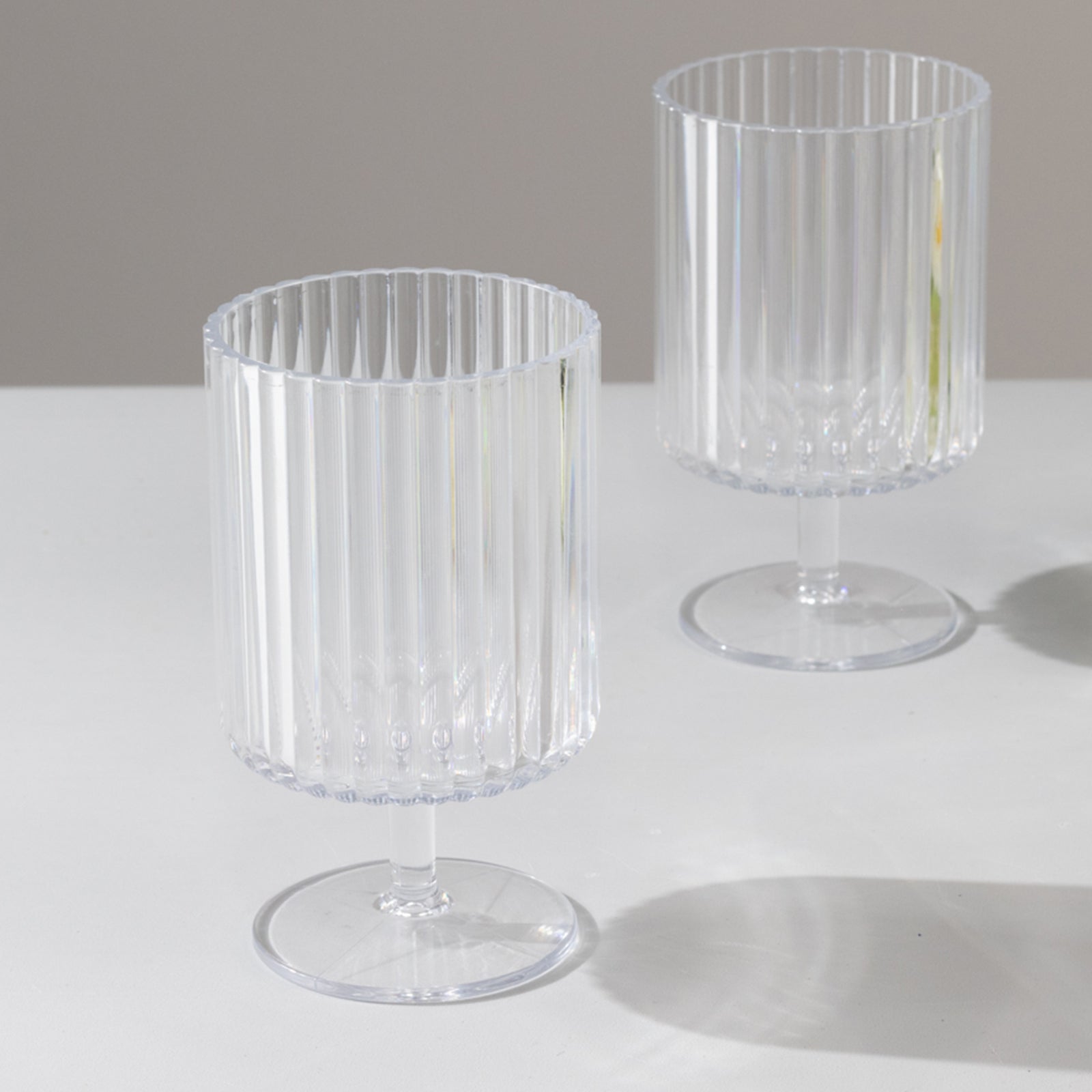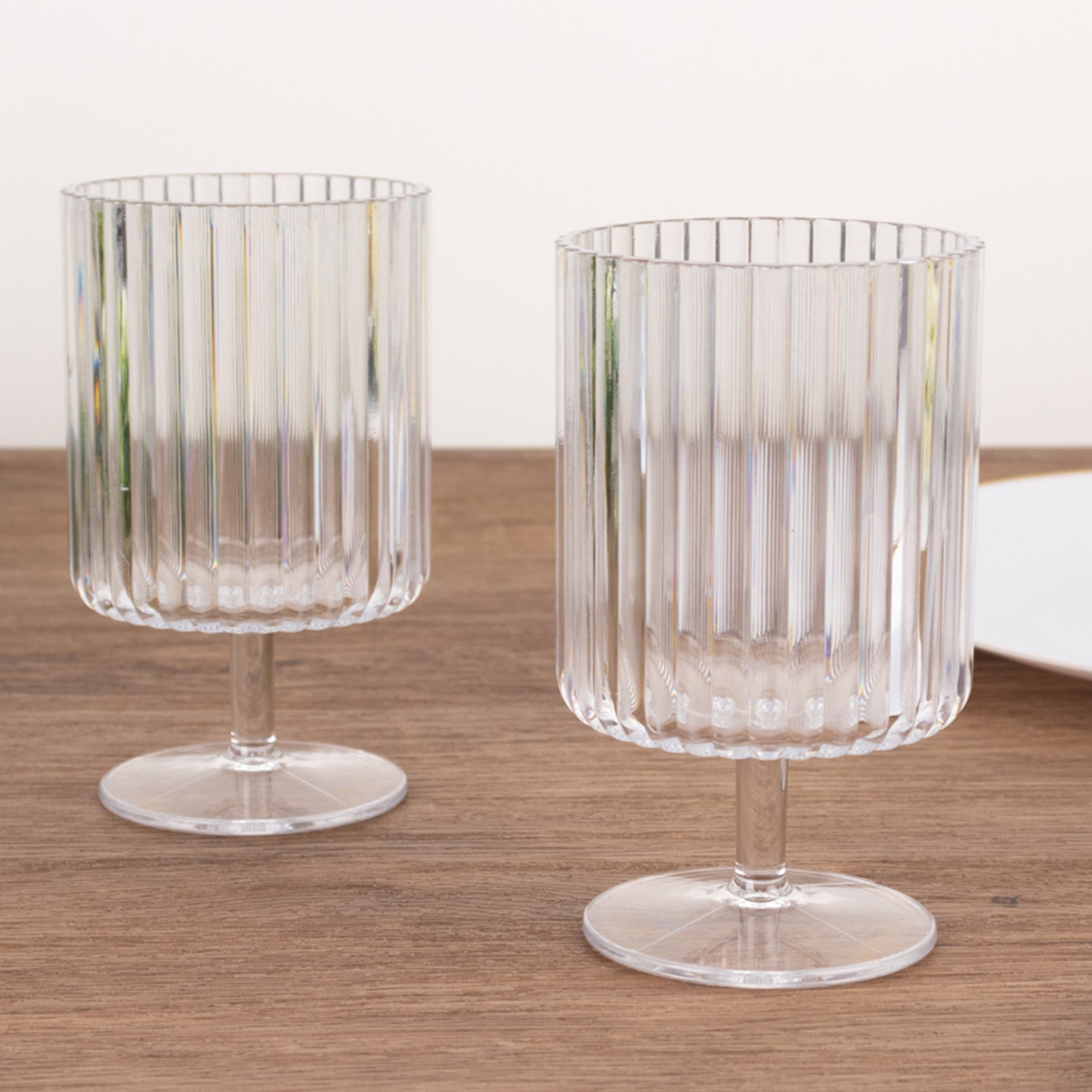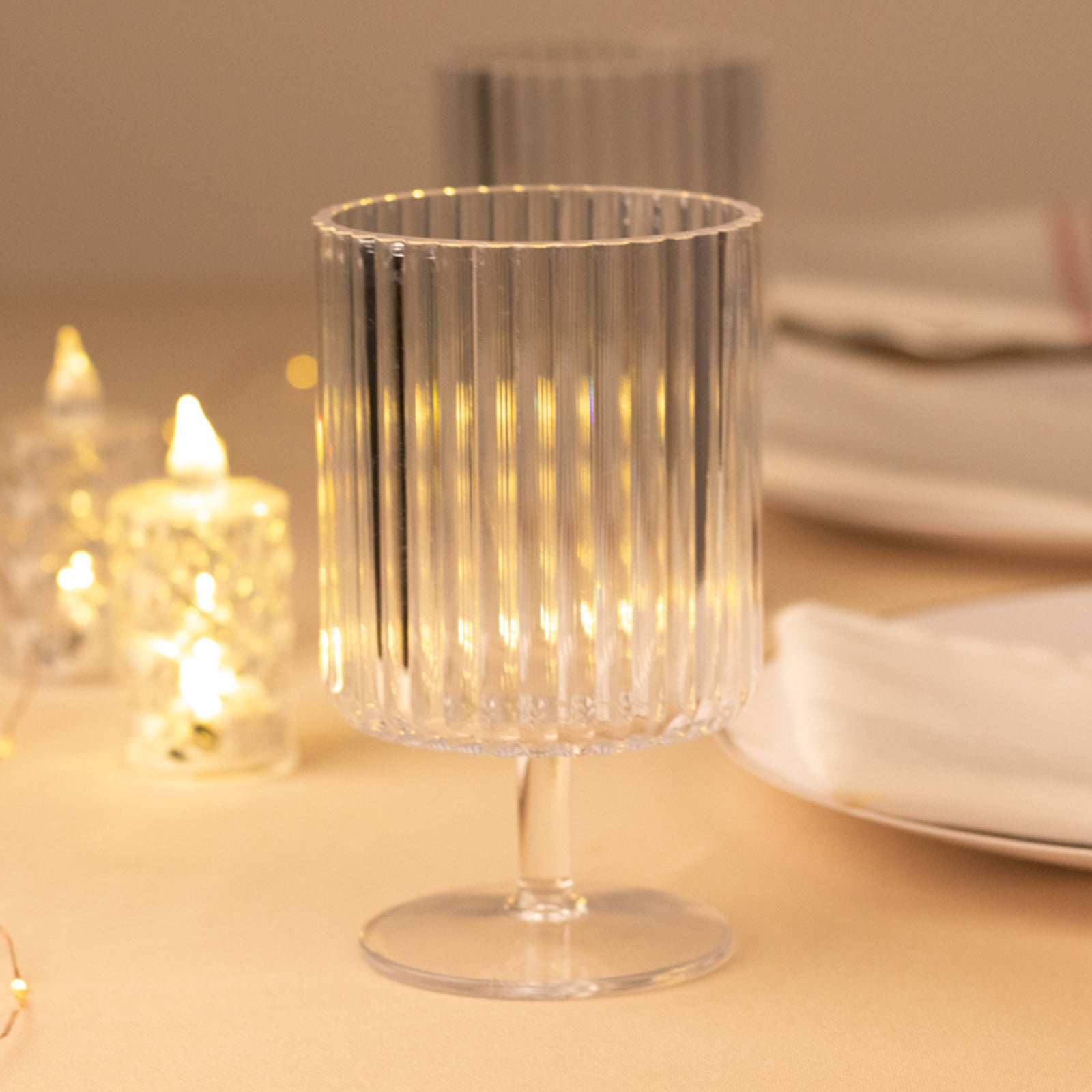 With their clear, sophisticated design, these goblets allow you to highlight other elements of your tablescape, making them perfect for both formal and informal settings. They can be matched with centerpiece LED lights for a subtle glow or surrounded by floral arrangements, creating a charming ambiance that ties the entire decor together. The short stem and ribbed design make them visually interesting and functional, ensuring they stand out on their own or as part of an intricately arranged table.