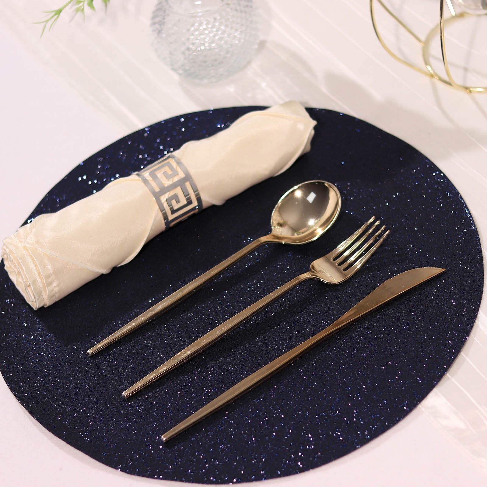 Incorporate Navy Blue Sparkle Placemats into your event decor for a stunning effect. Use them as a base for elegant centerpieces. Pair them with floral arrangements or candles for added charm.