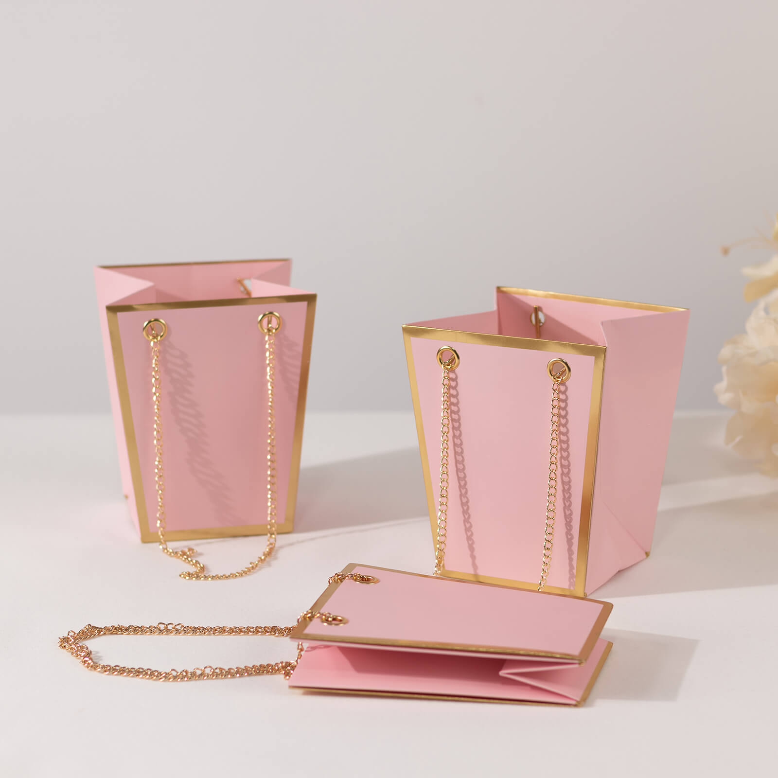 6 Pack Pink Gold Edge Paper Flower Gift Bags With Metal Chain Handles, Trapezoid Party Favor Tote Bags - 5"x6"