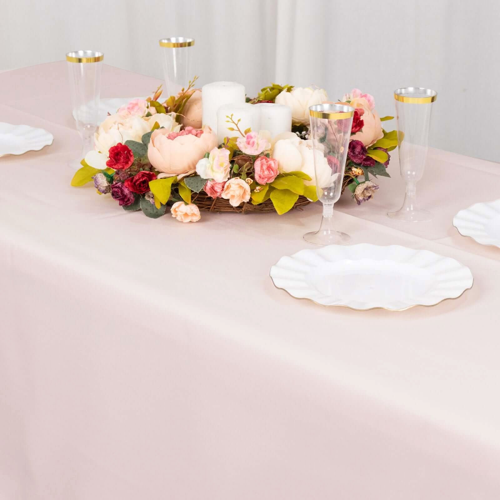 Blush tablecloths offer a versatile base for various decor styles. Pair them with gold or rose gold accents for a chic, modern look. Use metallic chargers and elegant dinnerware to elevate the table setting further.