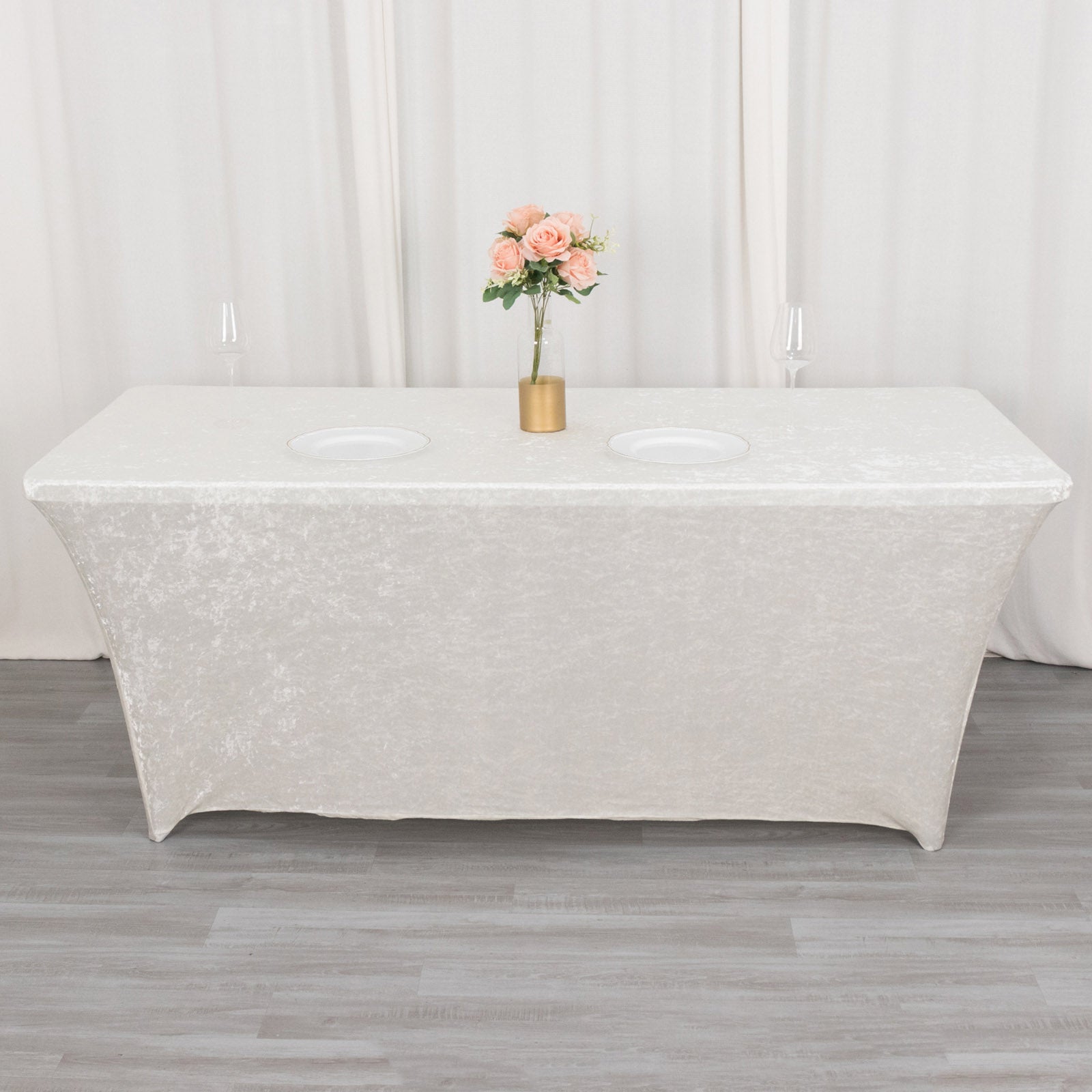 The 6ft White Crushed Velvet Spandex Fitted Rectangular Table Cover is designed for durability. Its high-quality materials resist wrinkles and stains, making it perfect for high-traffic events. This durability ensures your table cover looks pristine after multiple uses.
