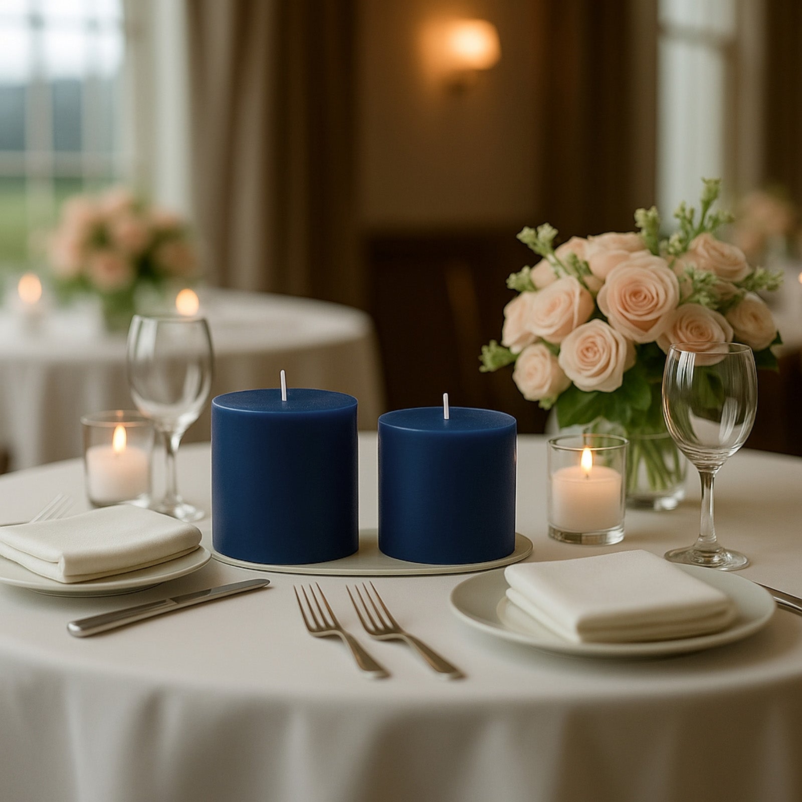Rich in color and timeless in design, this 6-pack of 3"x3" unscented dripless Navy Blue pillar candles from TCFLinen exudes sophistication. Made from high-quality paraffin wax with cotton wicks, they offer a smokeless, clean burn that keeps your Table Linens pristine. The deep Navy Blue shade adds contrast and calm—perfect for weddings, formal dinners, or nautical themes.