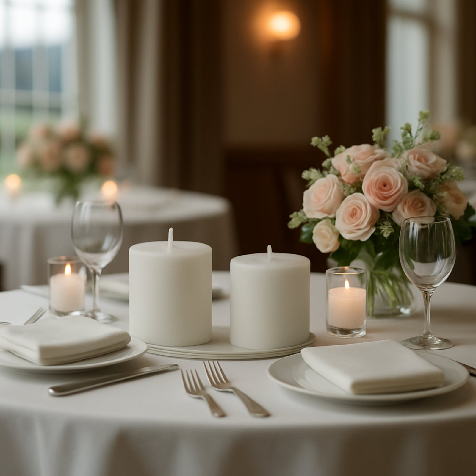 Pair these candles with Candelabras for dramatic centerpieces, or align them along Tablecloths for an all-white design theme. Their soft flame enhances Lighting and Candles in reception halls, restaurants, and home events.