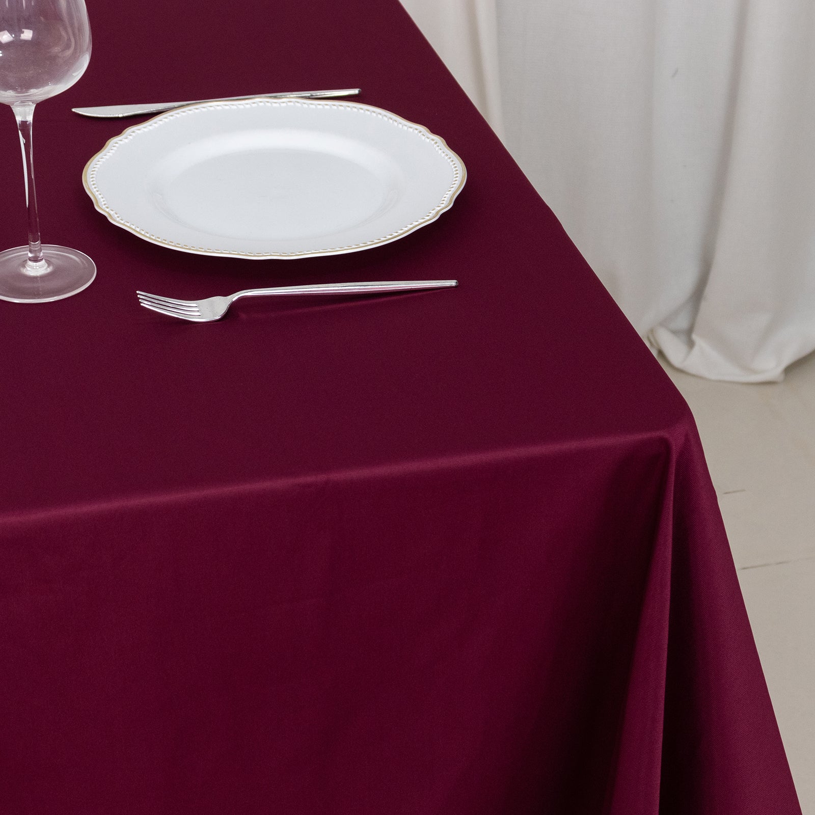 Burgundy tablecloths can be styled in many ways to create stunning table settings. Pair them with gold or silver charger plates for a touch of elegance. The rich color complements metallics beautifully, adding a regal feel.