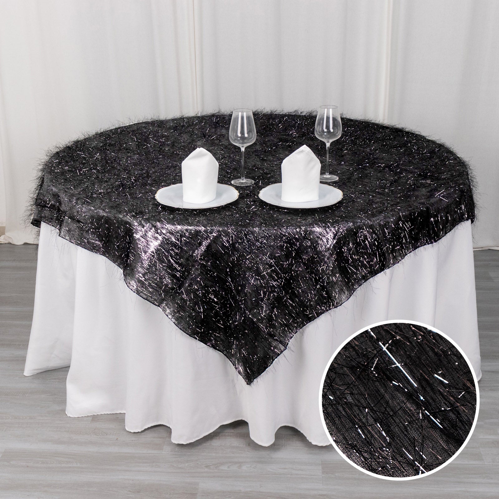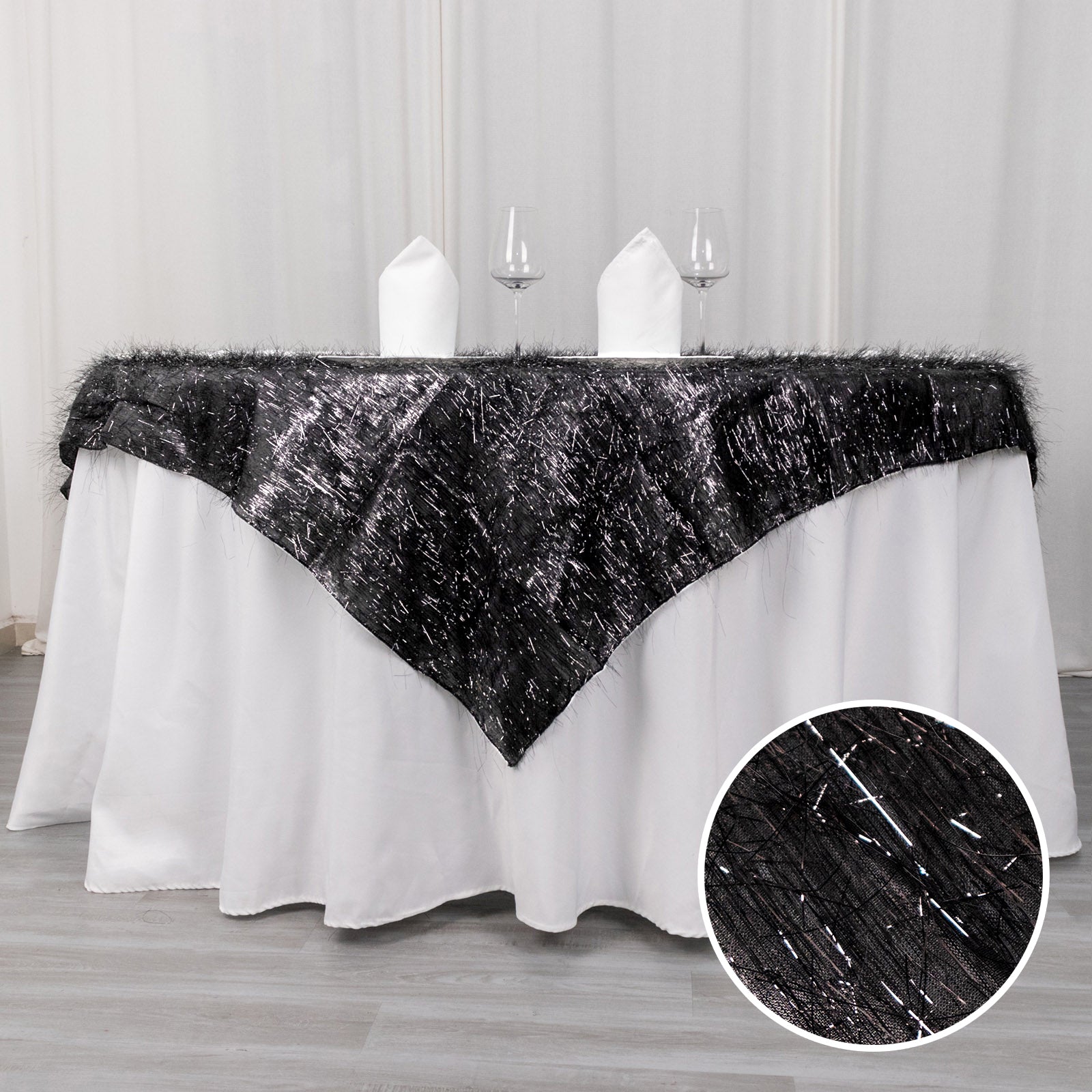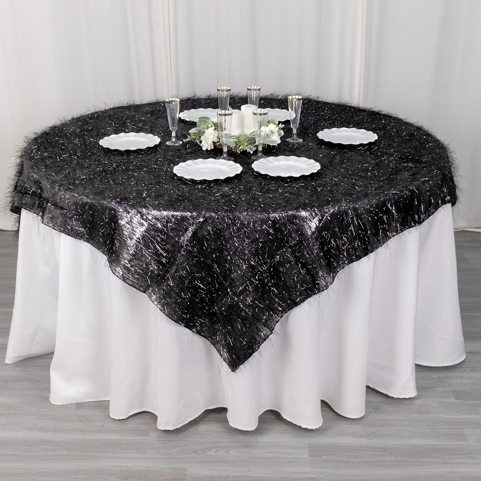 The 72" Black Metallic Fringe Shag Tinsel Table Overlay offers a unique texture. Its shag tinsel fabric creates a rich, layered look. This adds depth and dimension to your table settings.