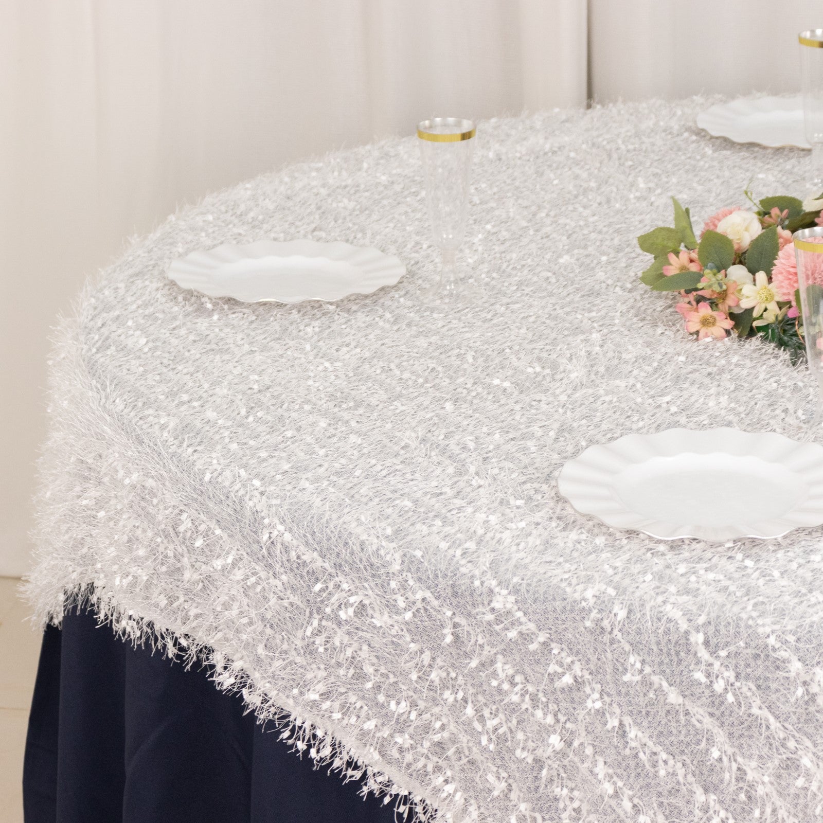 The 72"x72" White Fringe Shag Square Polyester Table Overlay adds elegance to any table. Its unique fringe shag design creates a luxurious texture that enhances the overall decor. This overlay is perfect for weddings, corporate events, and galas, making your tables stand out.