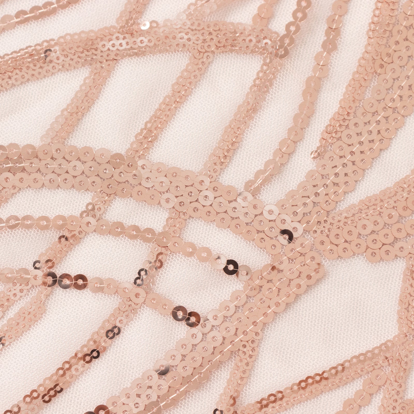 The Blush Wave Mesh Square Table Overlay features an elegant shimmering design. Its intricate wave embroidery adds depth and sophistication. The overlay is adorned with embroidered sequins that catch the light beautifully, creating a stunning visual effect.
