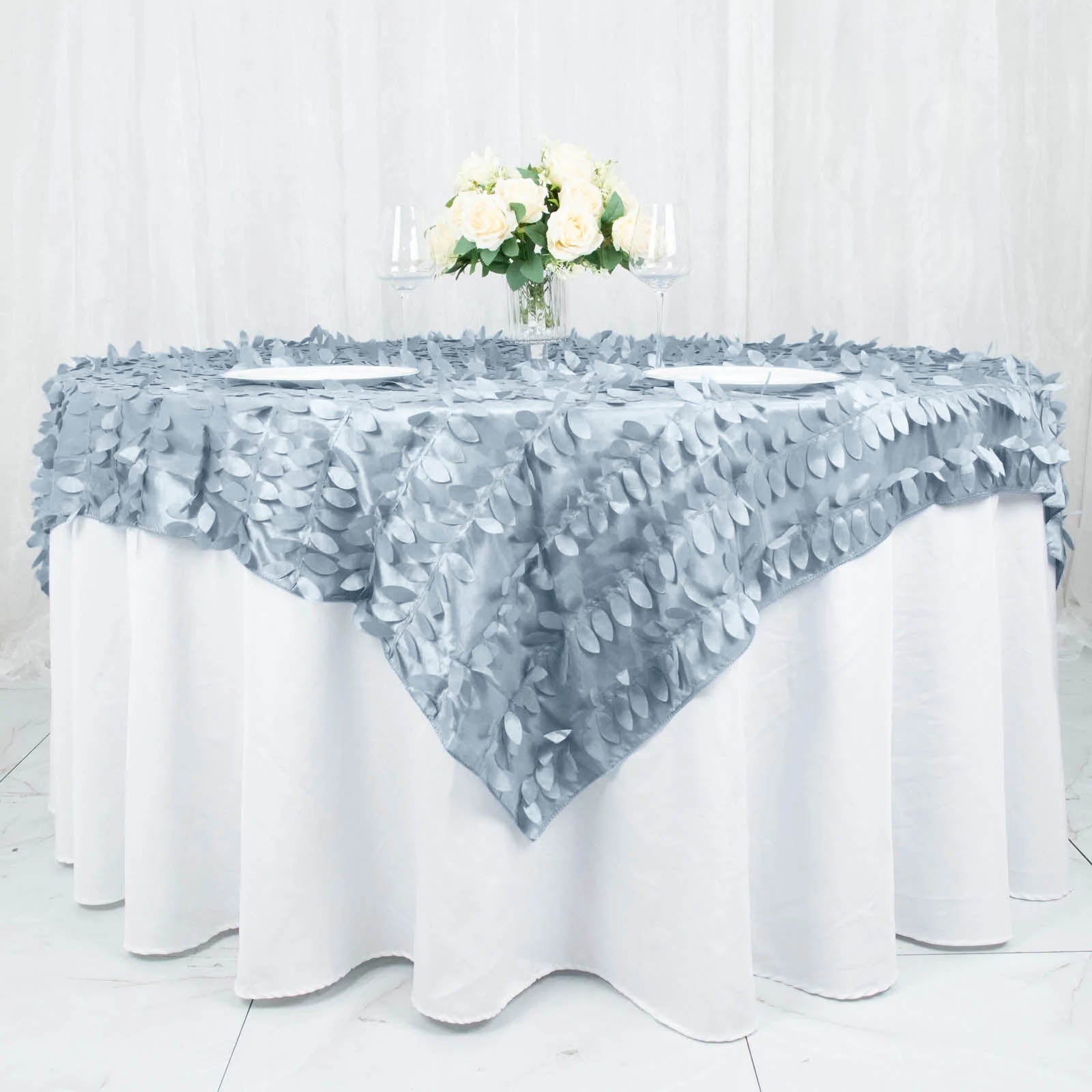 Transform your event with the Dusty Blue 3D Leaf Petal Taffeta Fabric Table Overlay. Layer it over white or beige tablecloths for a striking contrast. This combination creates a sophisticated and inviting atmosphere.