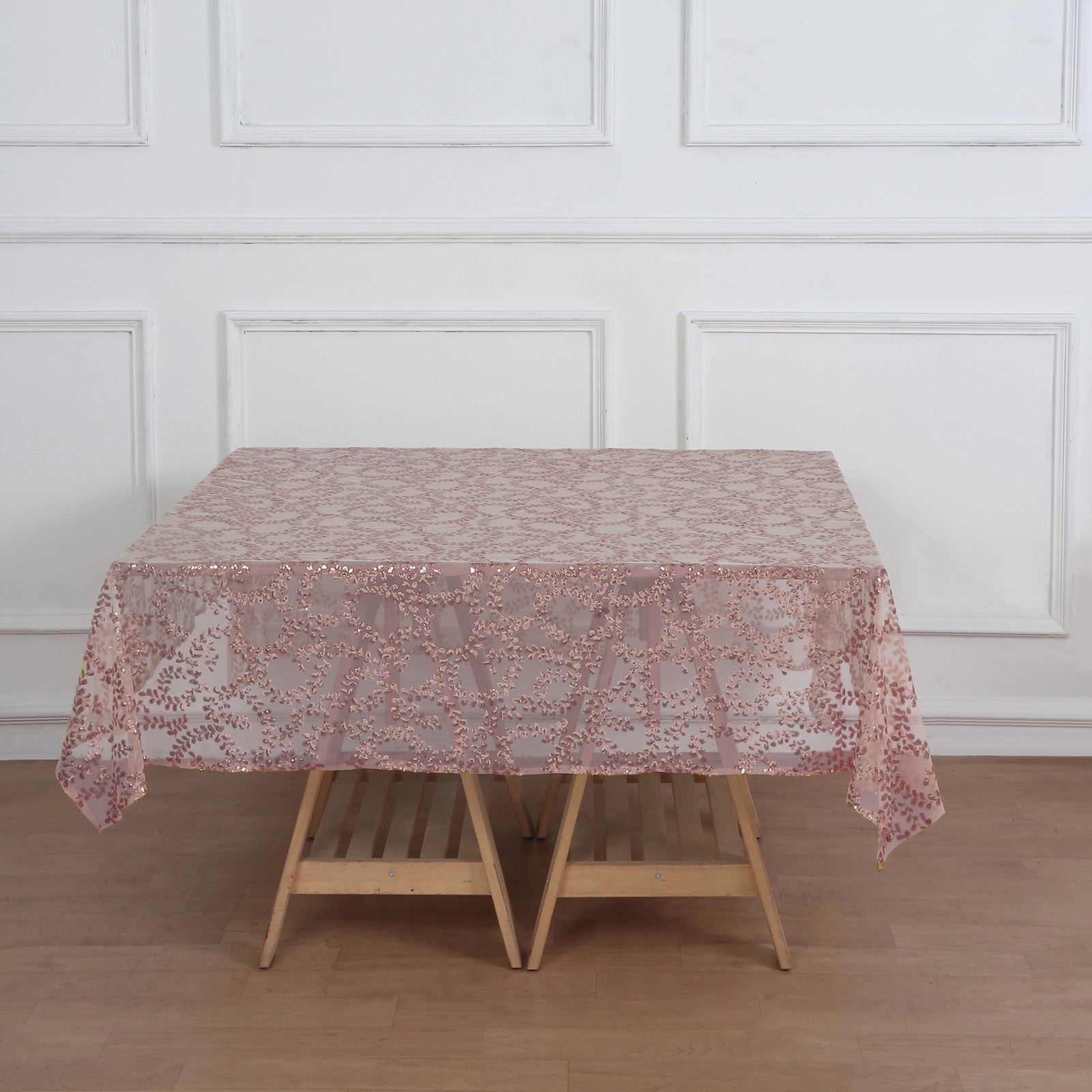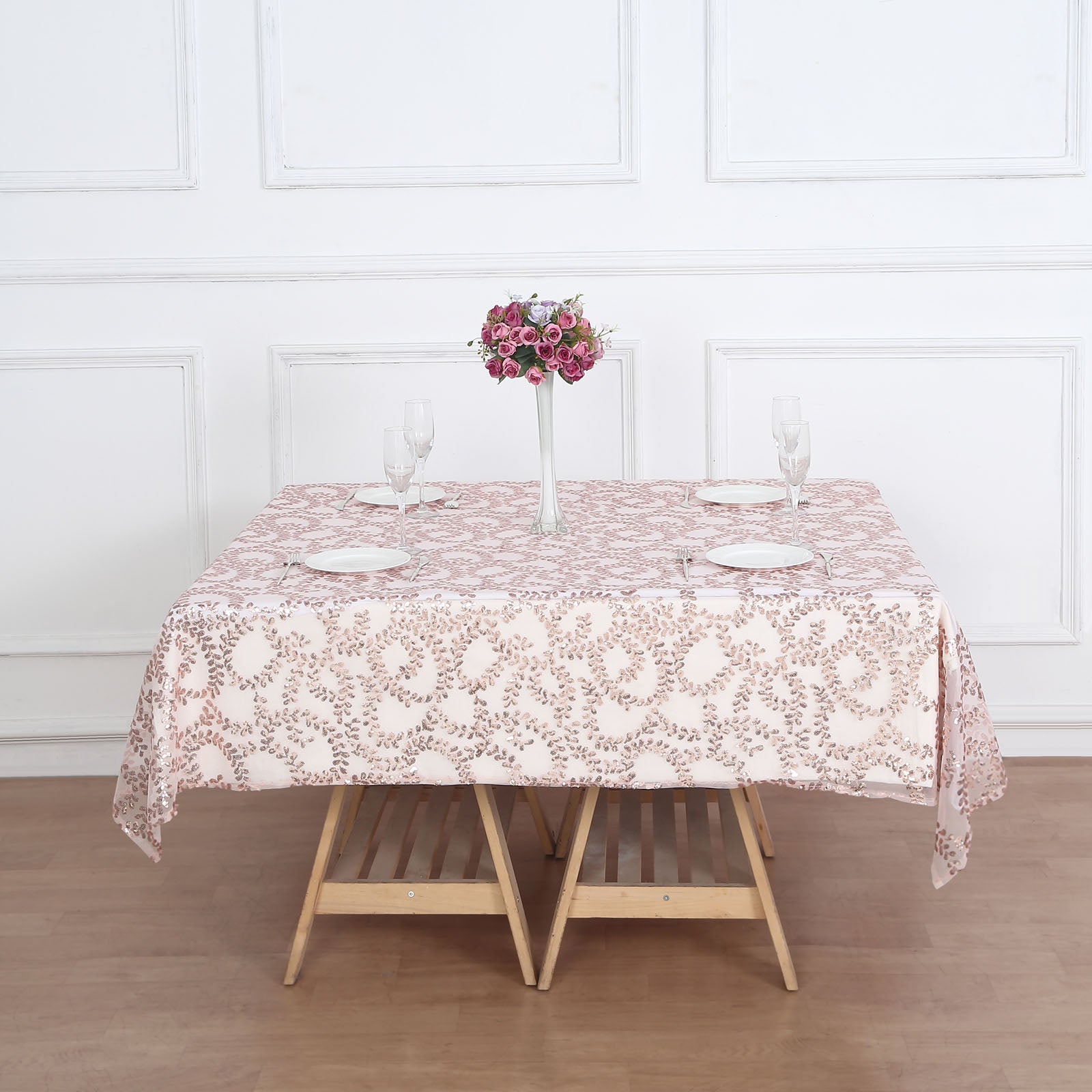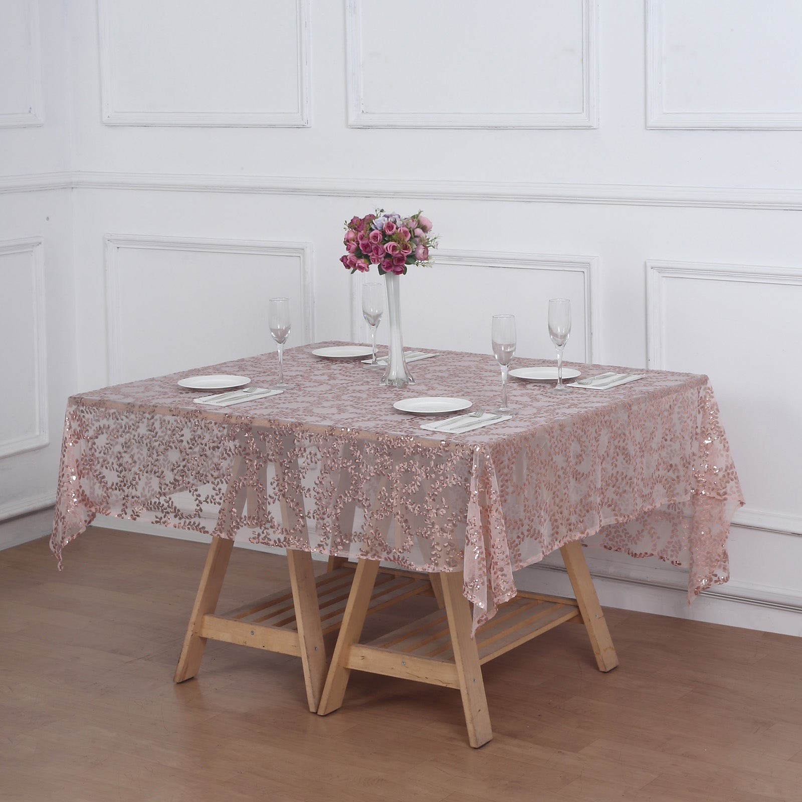 72"x72" Rose Gold Sequin Leaf Embroidered Tulle Table Overlay, Square Sheer Table Topper