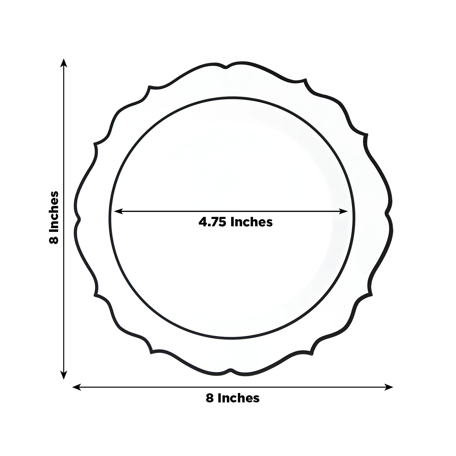 10-Pack Plastic 8" Round Dessert Plates in Clear with Black Scalloped Rim - Disposable Appetizer/Salad Plates