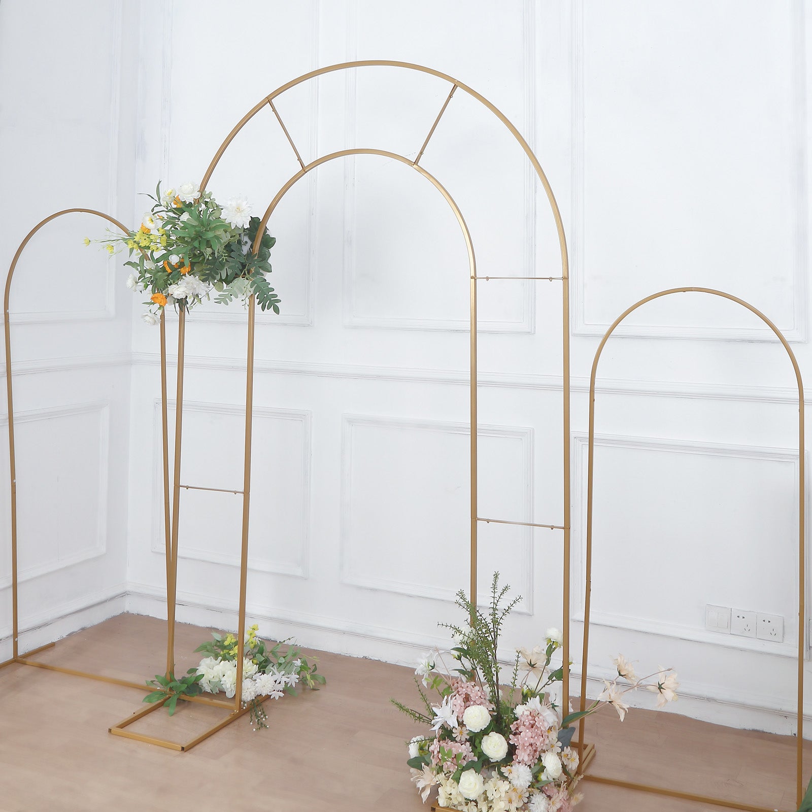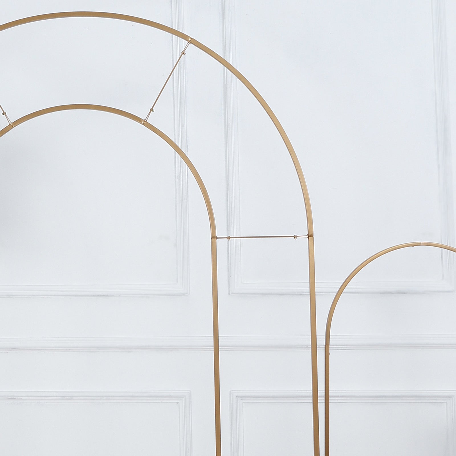 The 8ft Tall Gold Metal Round Top Double Arch Stand is built to impress. It features a robust design. Crafted from high-quality gold metal, this stand is durable and visually striking.