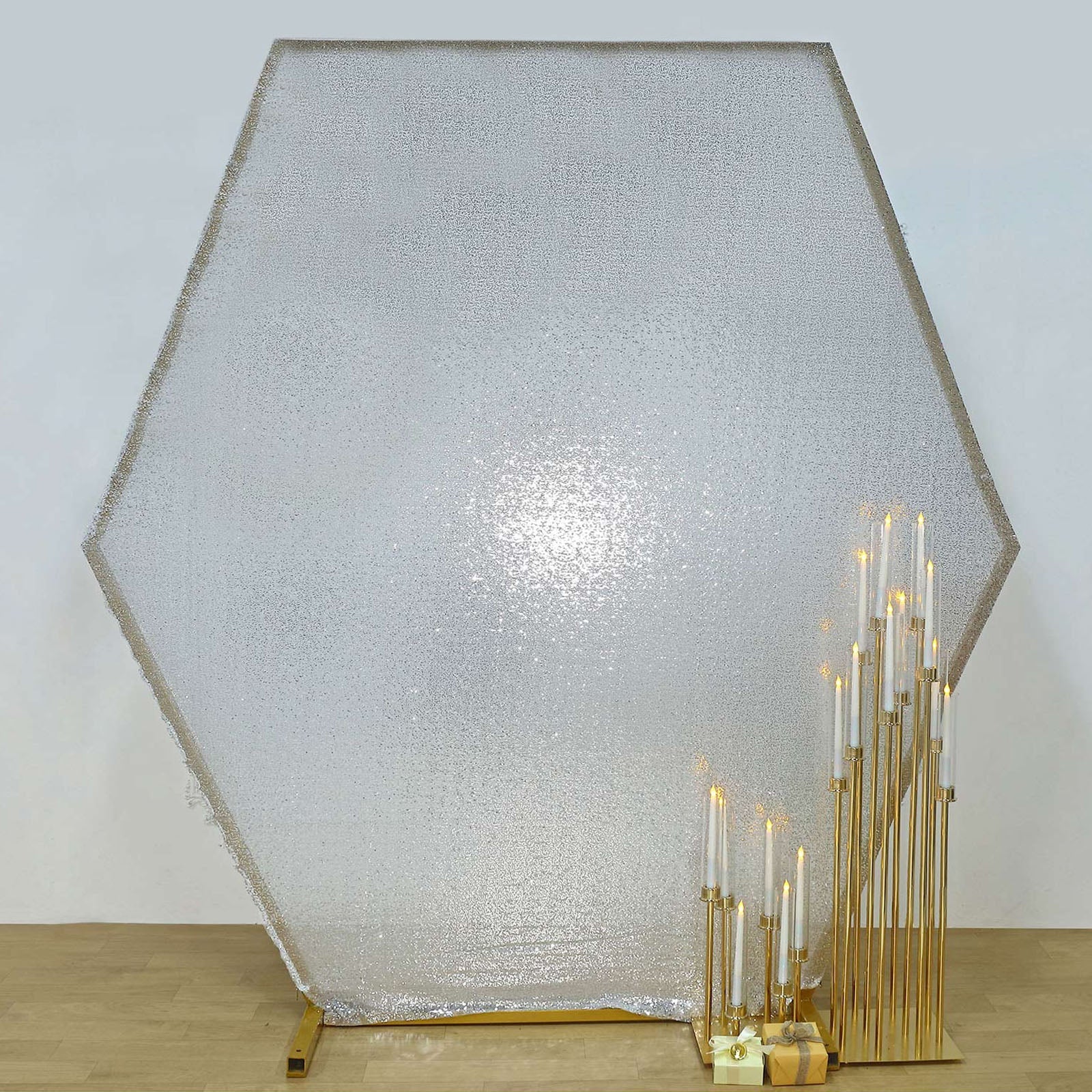 Transform any event with our 8ftx7ft Metallic Silver Sparkle Sequin Hexagon Wedding Arch Cover. This stunning backdrop adds a touch of elegance and sophistication to your decor. The metallic silver color creates a sleek and modern look that is perfect for weddings, parties, and special occasions.