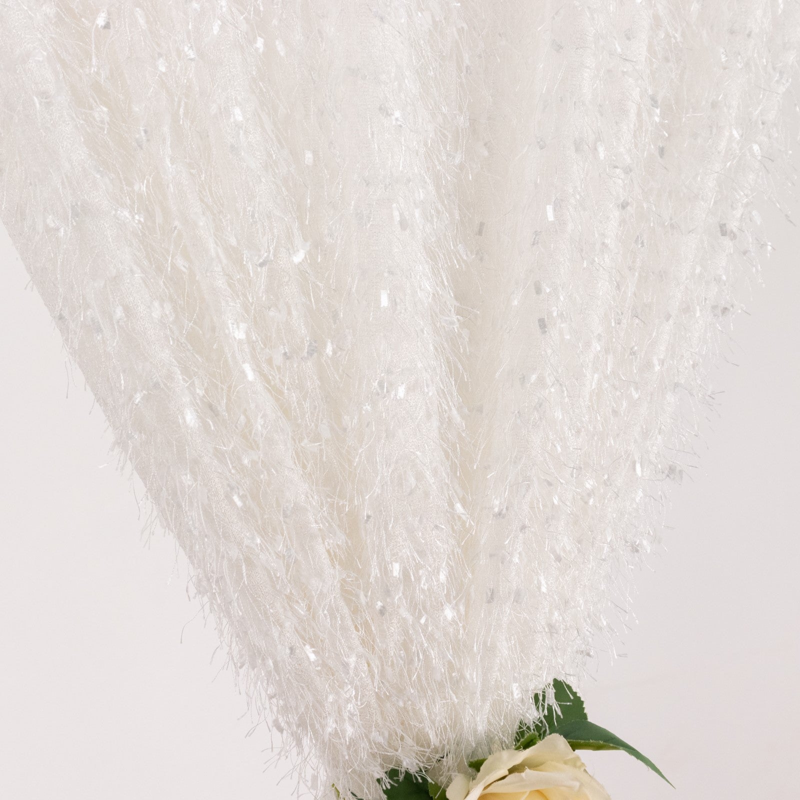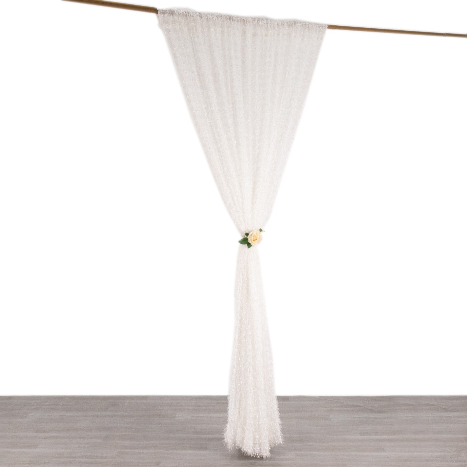 The 8ftx8ft White Fringe Shag Drapery Panel adds a touch of luxury. Crafted from premium polyester, it features a soft, shaggy texture. This unique design enhances the elegance of any wedding or event.