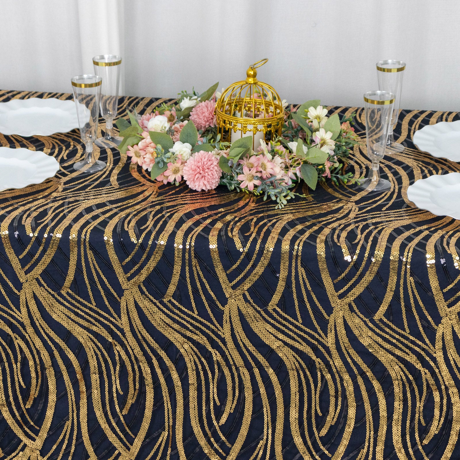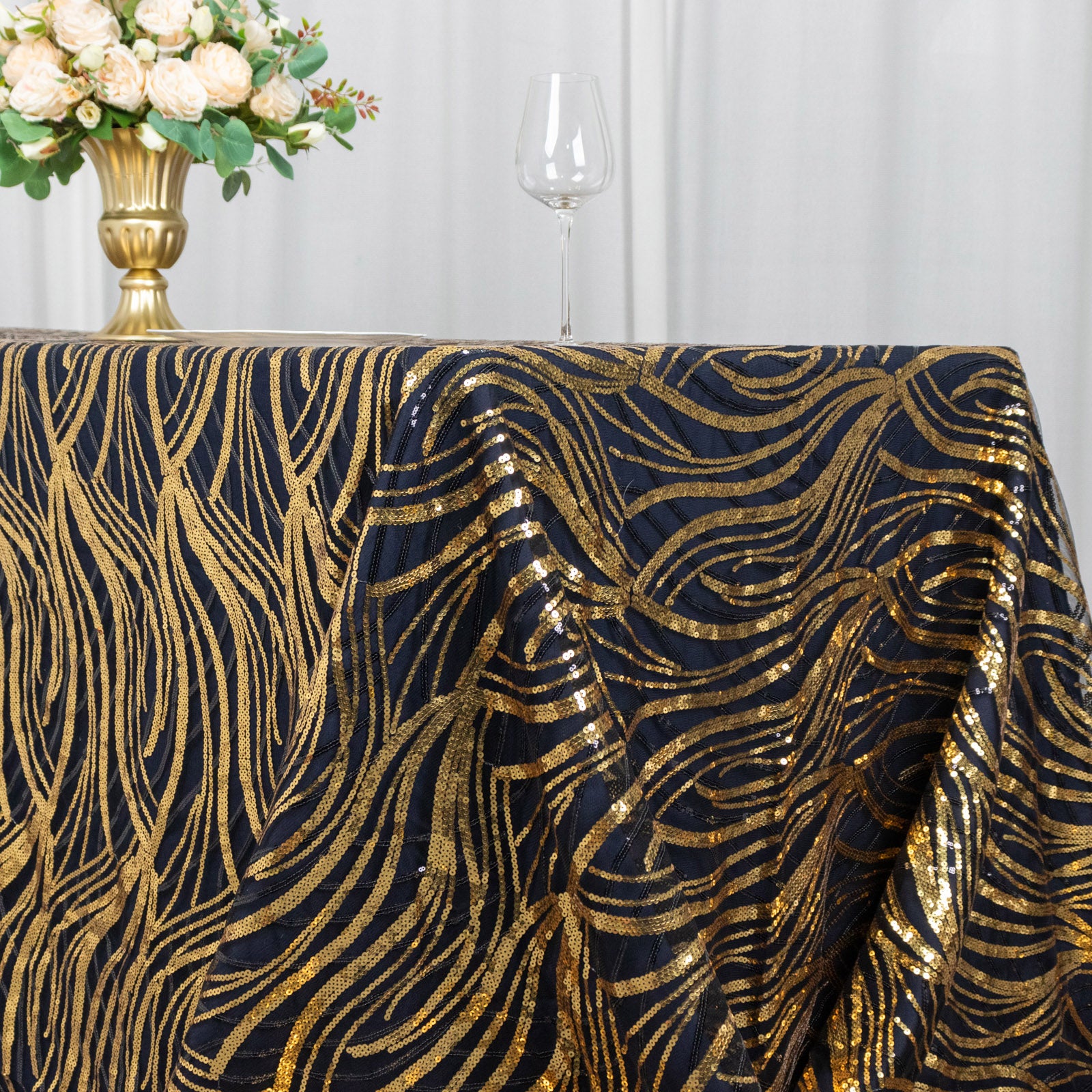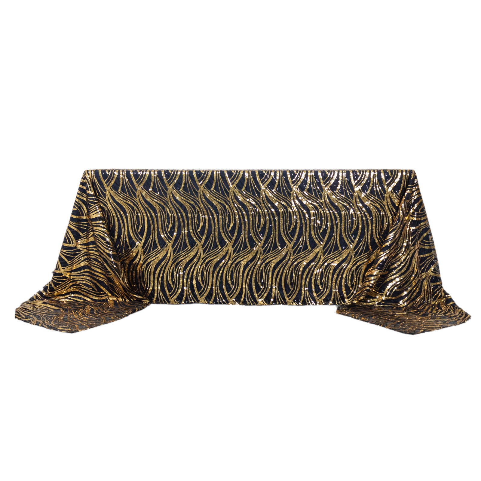 90"x156" Black Gold Wave Mesh Rectangular Tablecloth With Embroidered Sequins