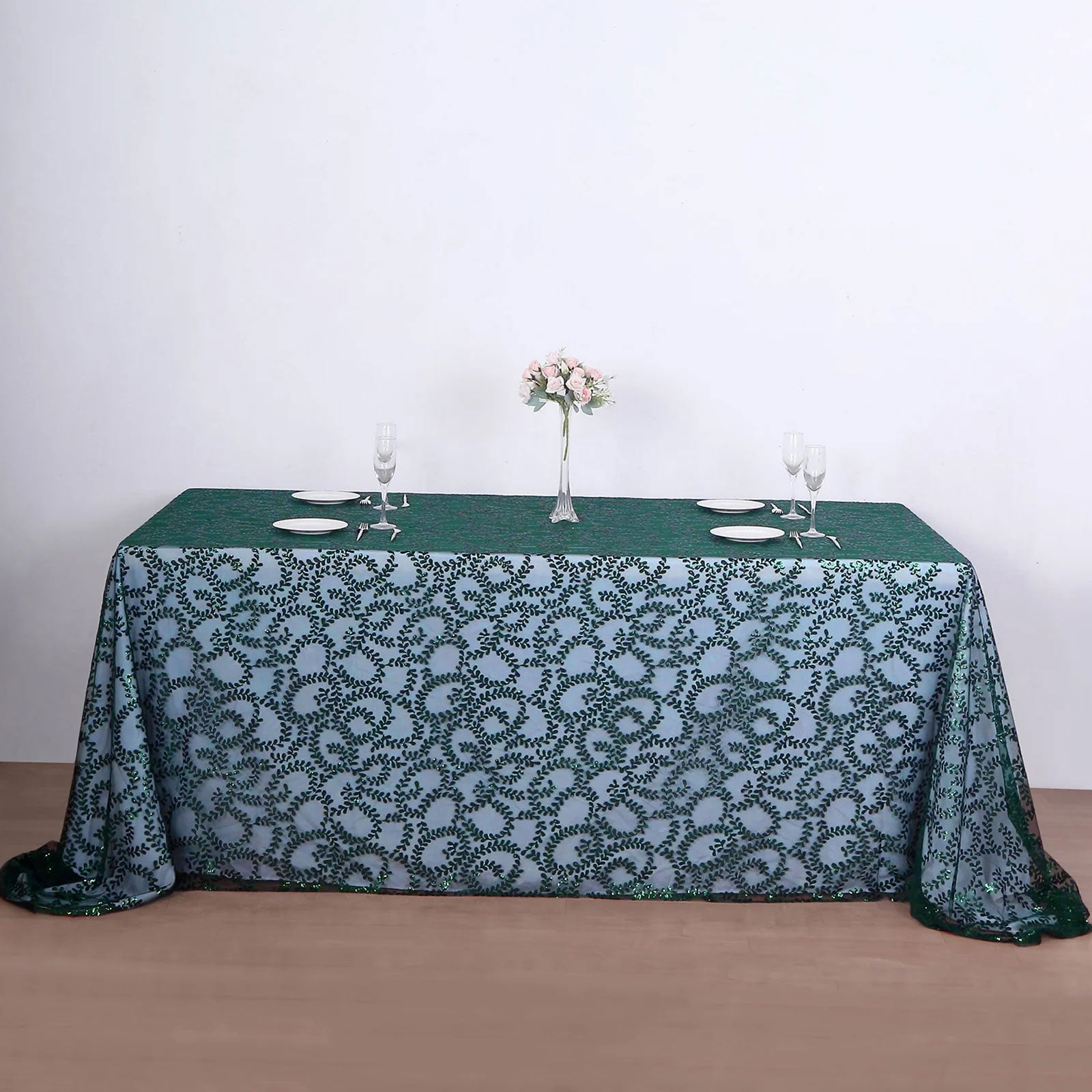 The Hunter Emerald Green Sequin Leaf Embroidered Tulle Tablecloth can be the centerpiece of your décor. Start by using it as the base for your table settings. Layer it with complementary table runners or place elegant charger plates on top for a sophisticated look.