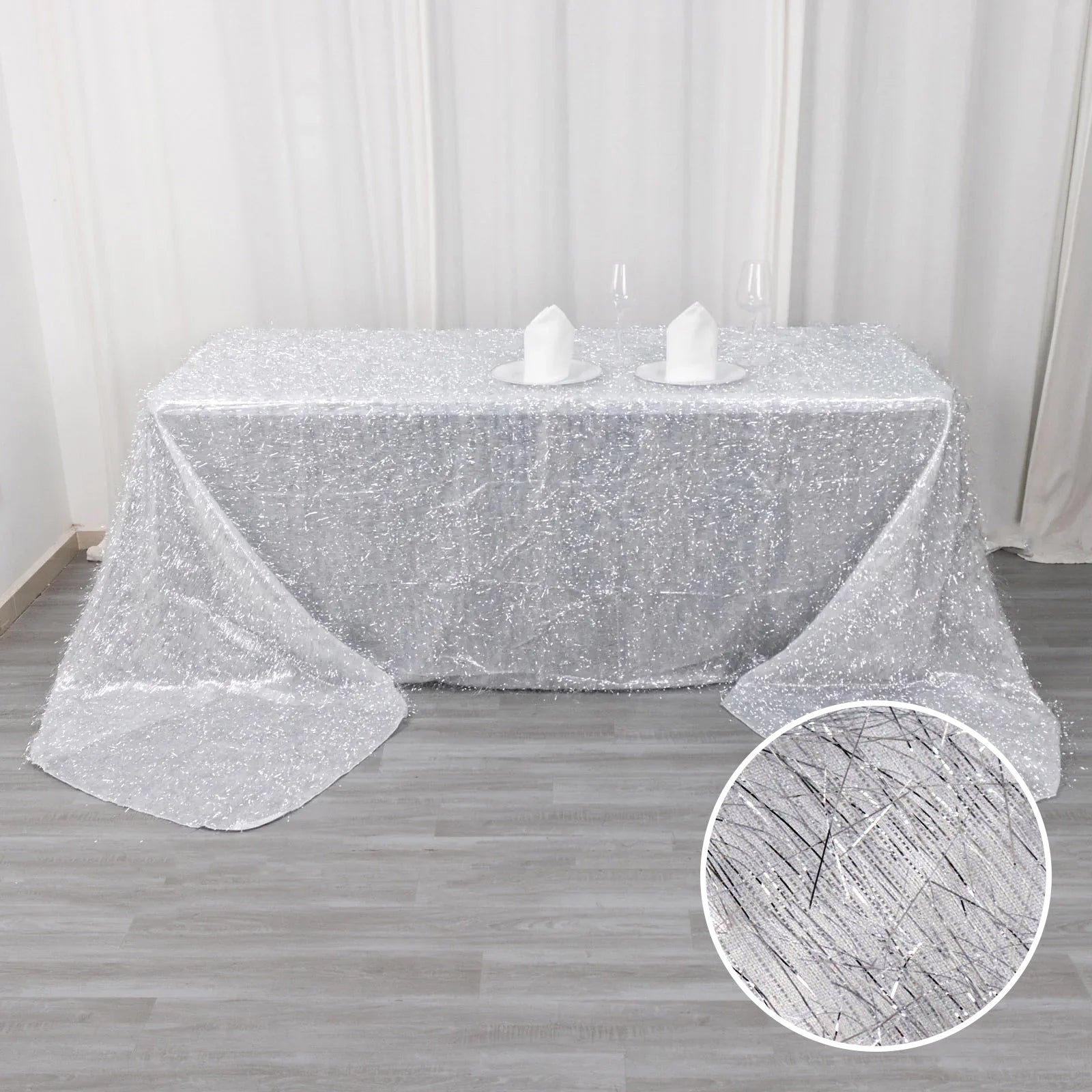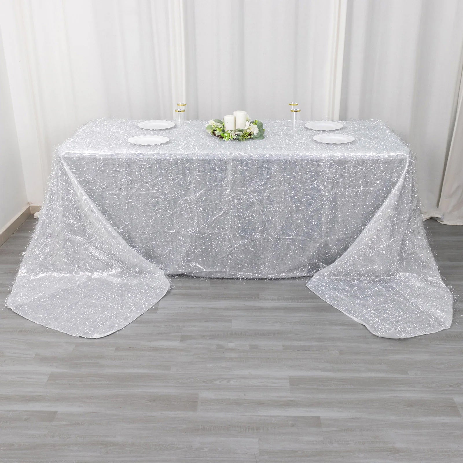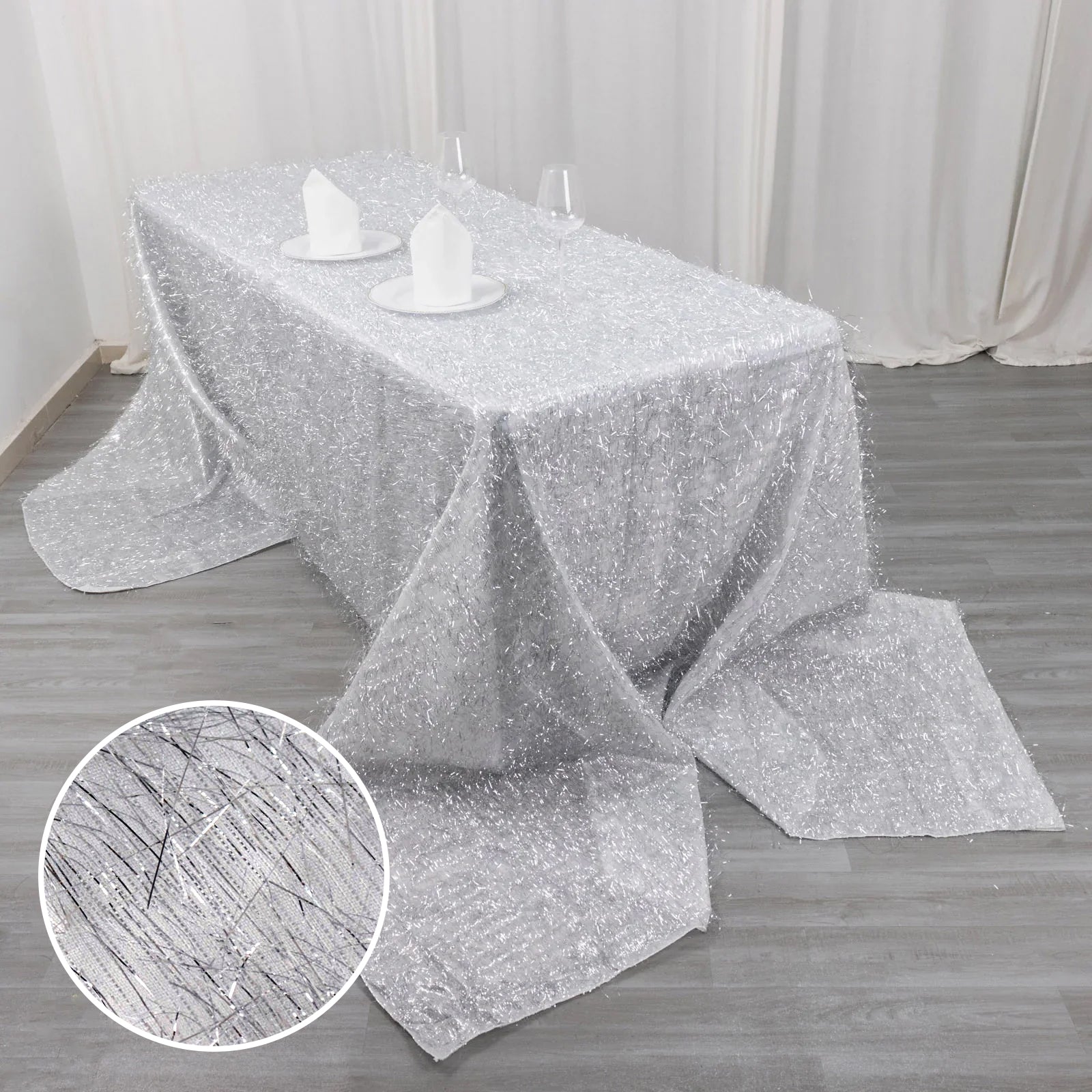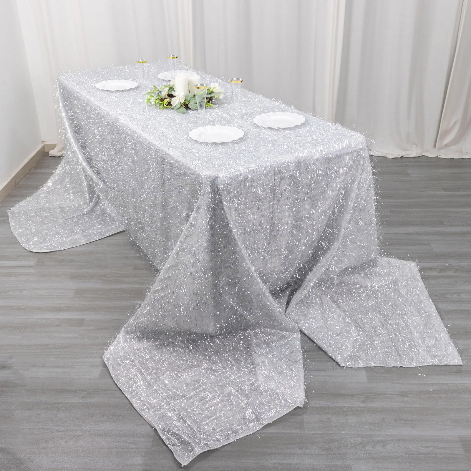 90"x156" Metallic Silver Premium Tinsel Shag Rectangular Tablecloth, Shimmery Metallic Fringe Polyester Tablecloth