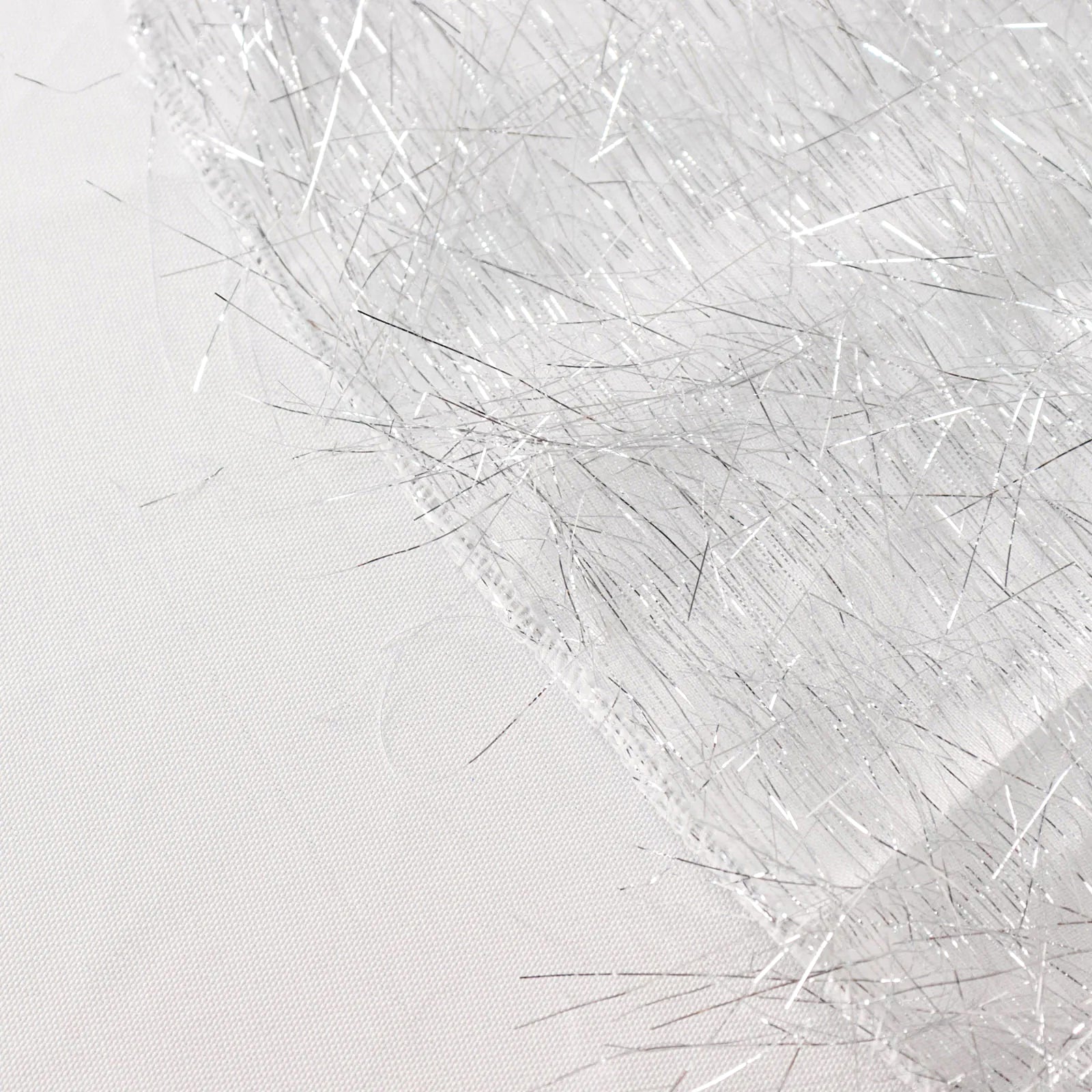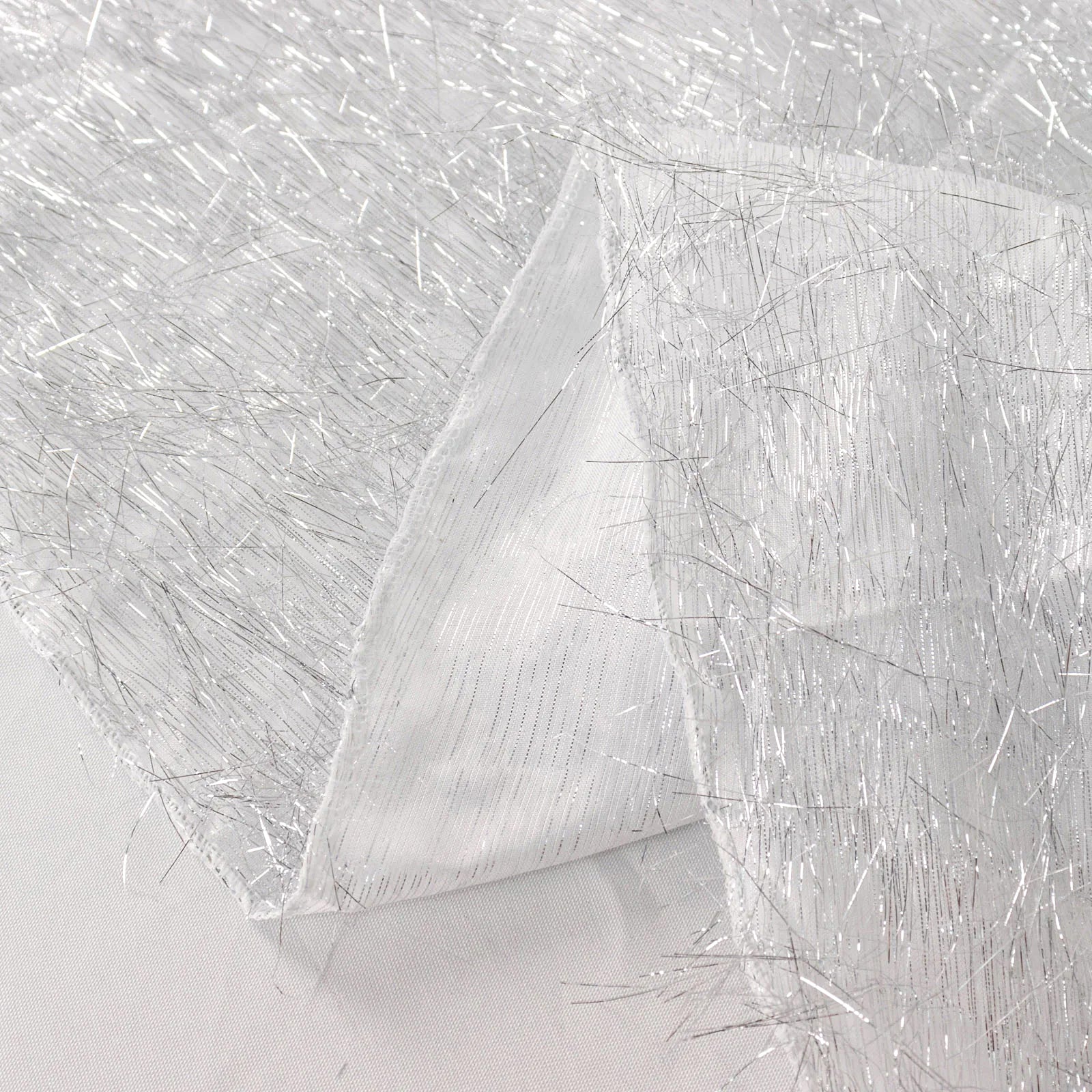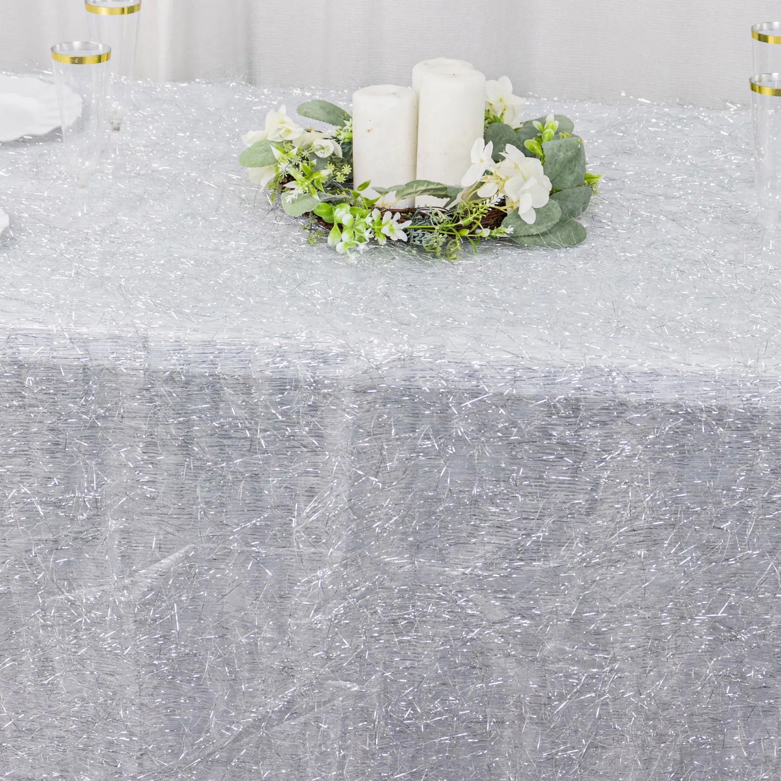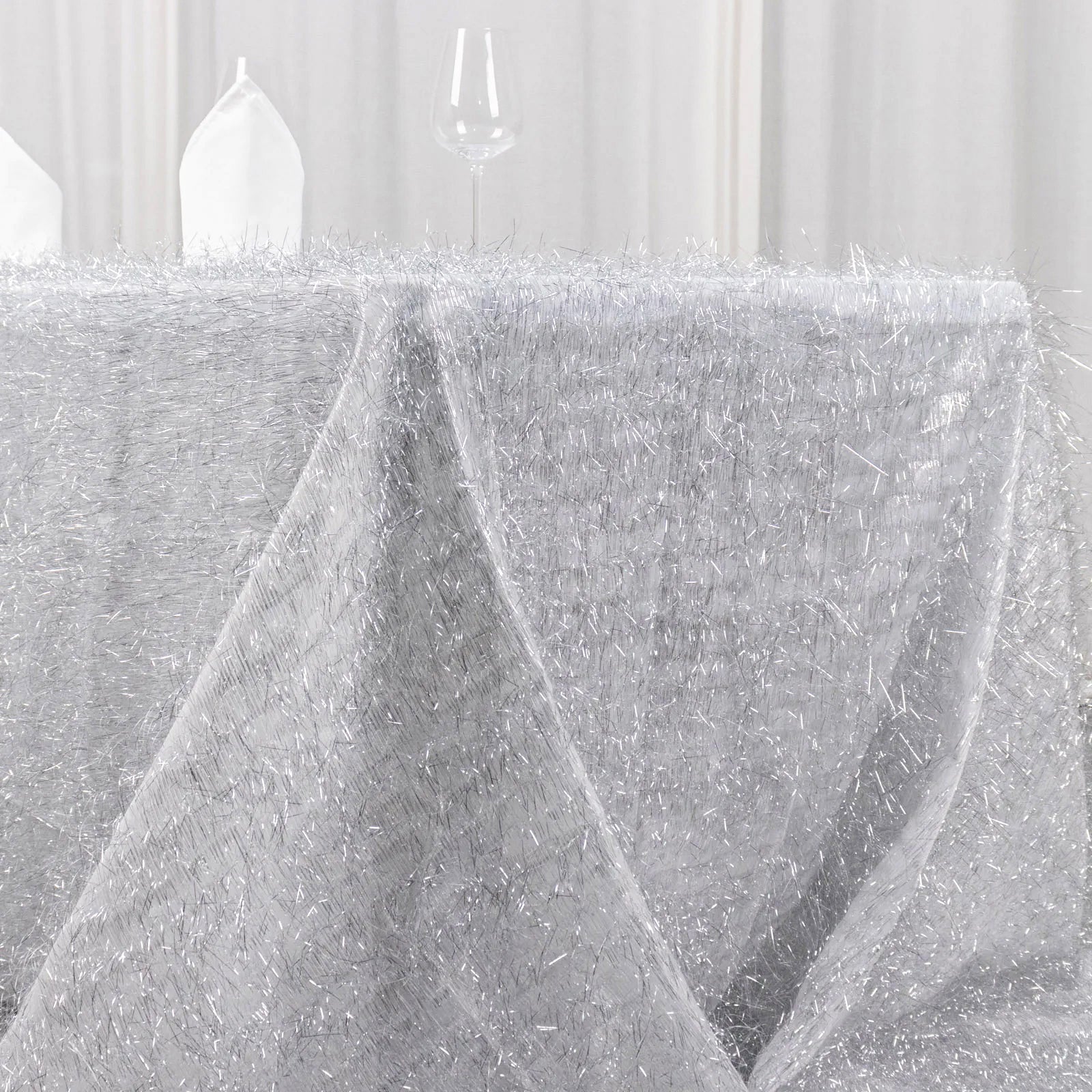 90"x156" Metallic Silver Premium Tinsel Shag Rectangular Tablecloth, Shimmery Metallic Fringe Polyester Tablecloth