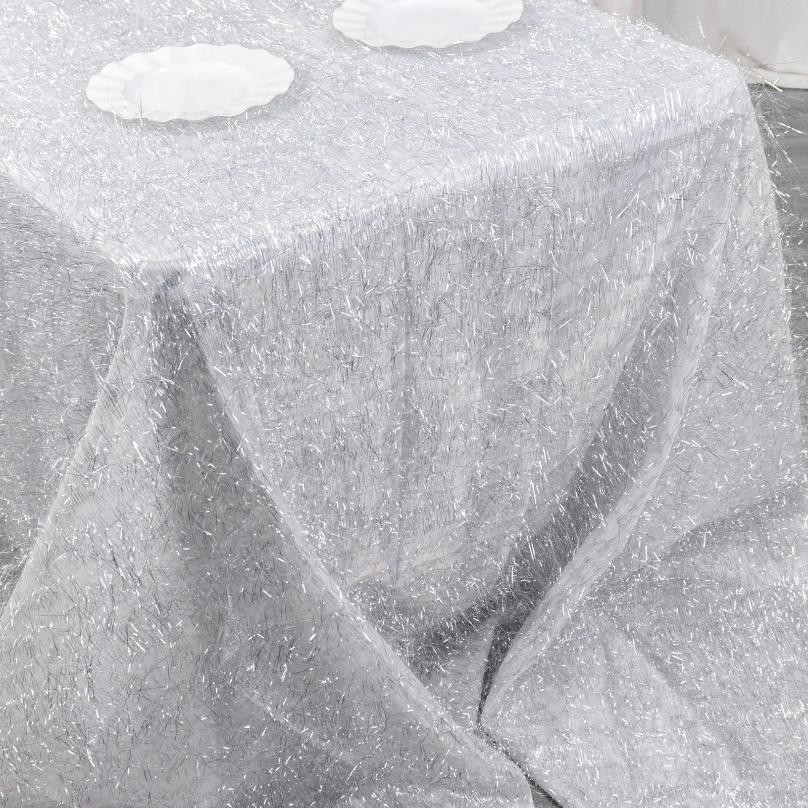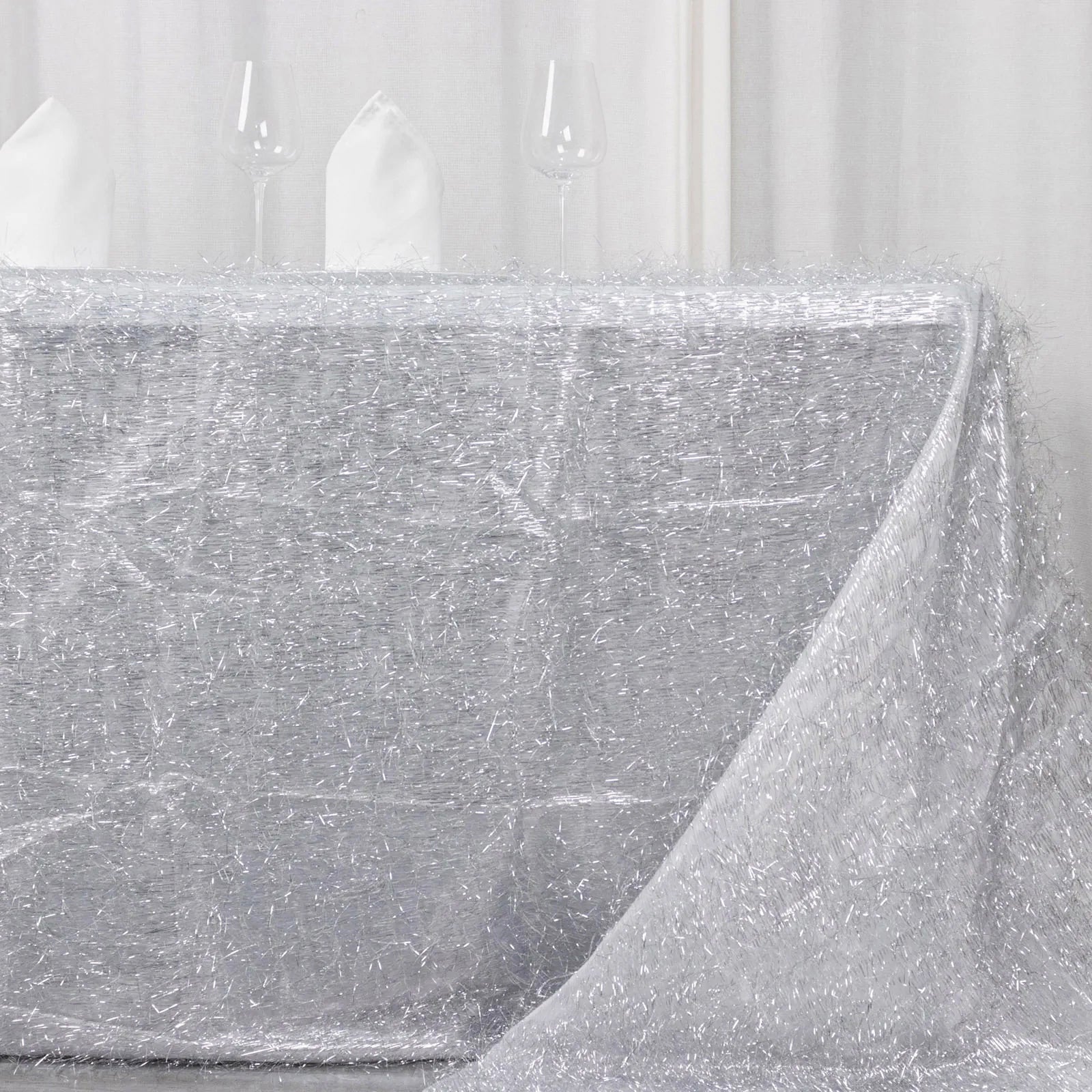 The 90"x156" Metallic Silver Premium Tinsel Shag Tablecloths is versatile. It fits perfectly into various themes and settings. Whether you're hosting a formal dinner or a casual gathering, this tablecloth adapts to your needs.