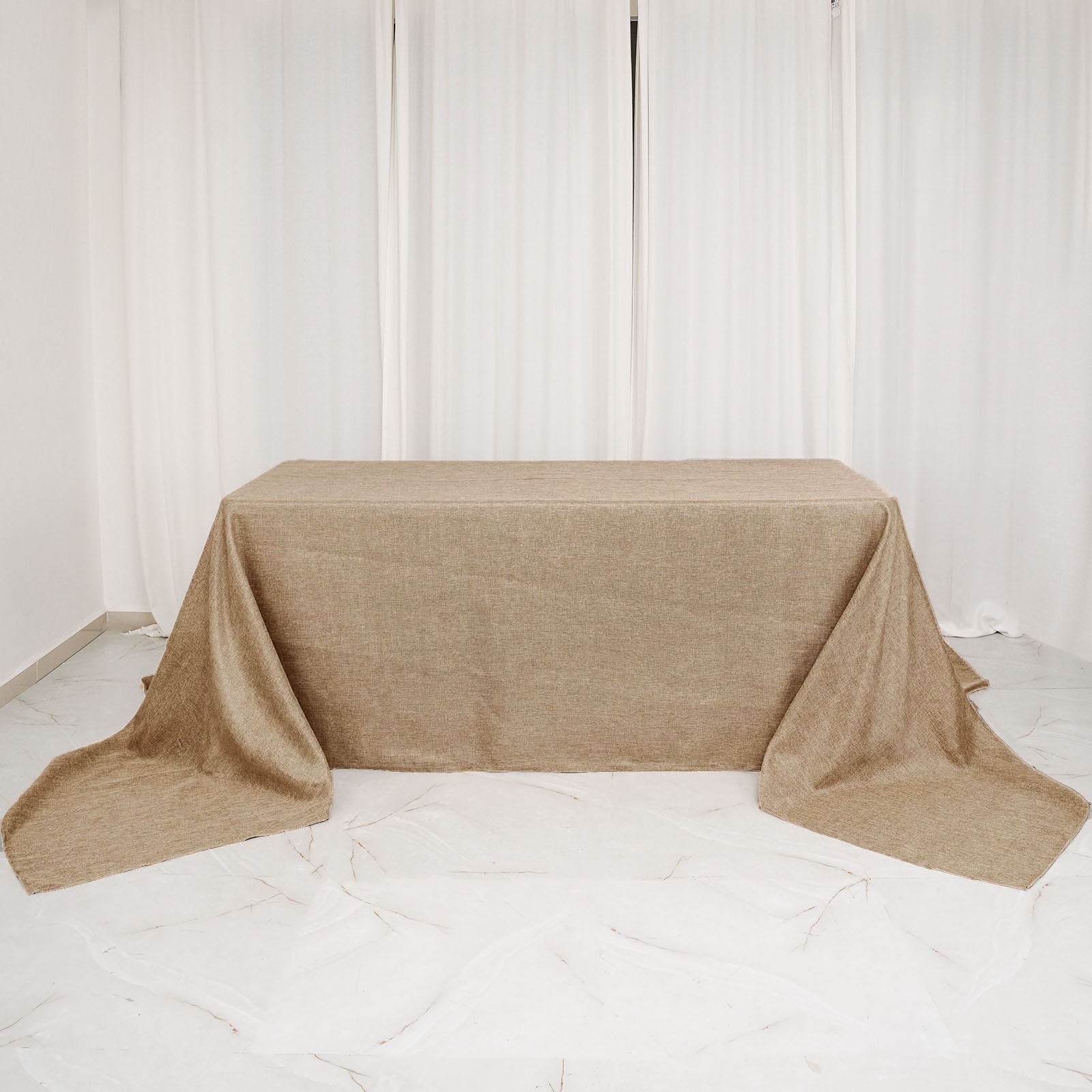 90"x156" Natural Seamless Faux Burlap Rectangle Tablecloth, Boho Chic Jute Table Linen for 8 Foot Table With Floor-Length Drop