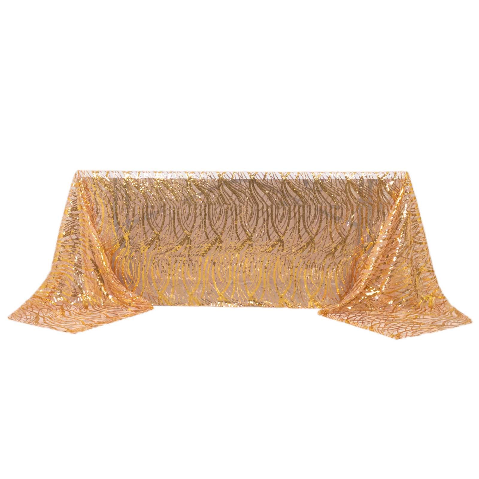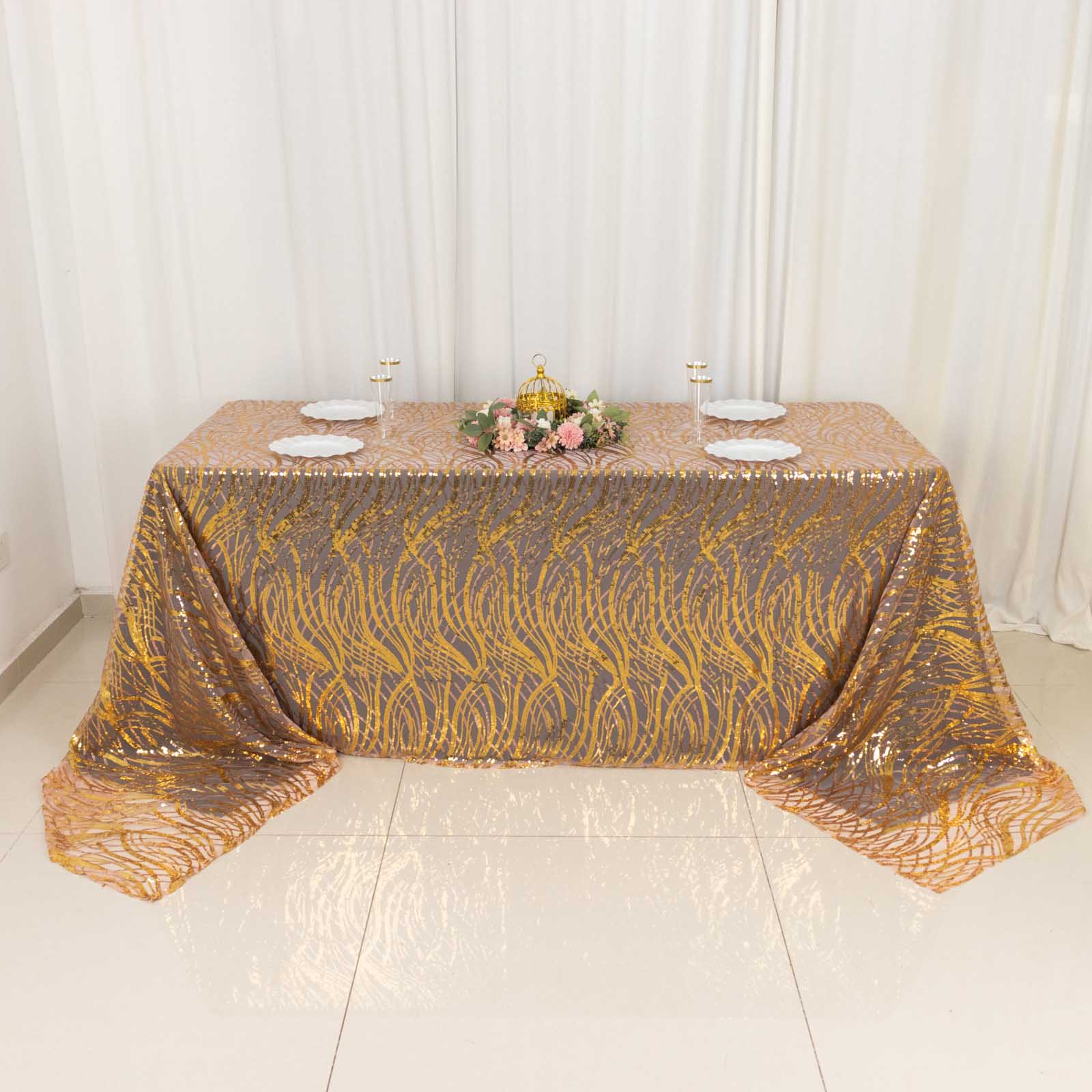 90"x156" Rose Gold Wave Mesh Rectangular Tablecloth With Gold Embroidered Sequins
