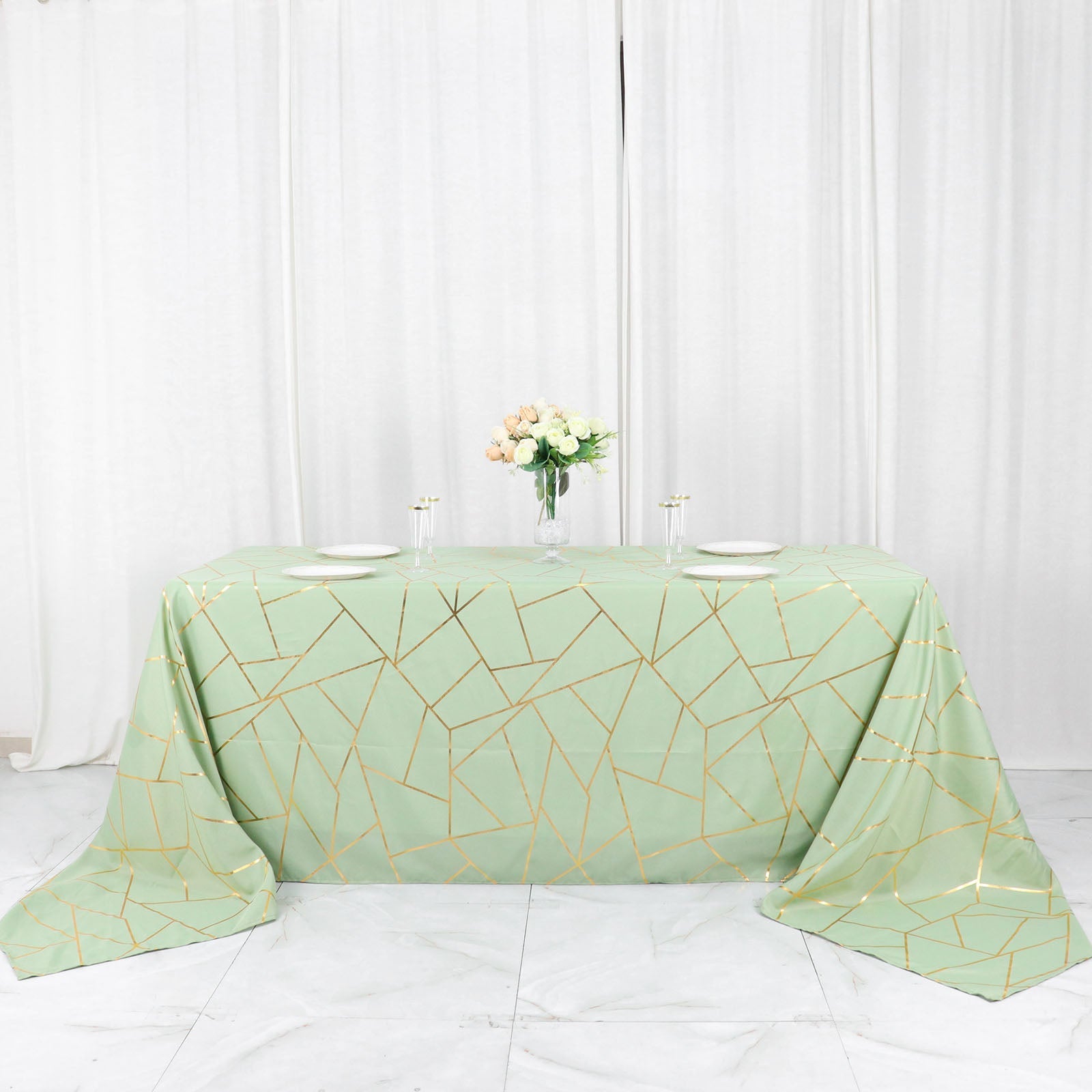 90"x156" Sage Green Seamless Rectangle Polyester Tablecloth With Gold Foil Geometric Pattern