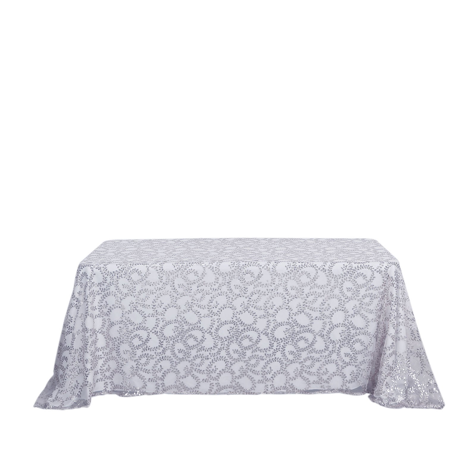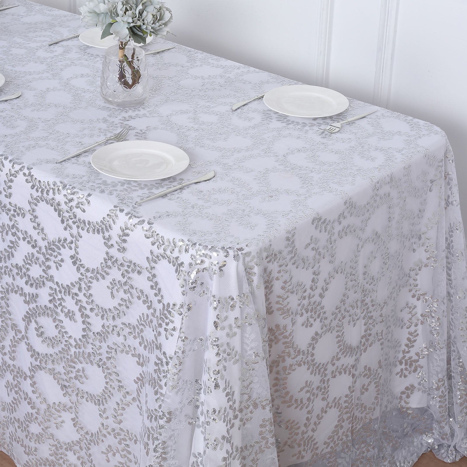 90"x156" Silver Sequin Leaf Embroidered Tulle Rectangular Tablecloth